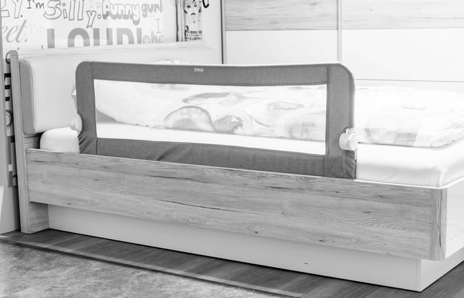 Aby zamontować, wystarczy umieścić poręcz łóżka na ramie z listew, zacisnąć pasek zabezpieczający i ponownie umieścić materac na górze. Dzięki specjalnej funkcji składania barierka łóżka można złożyć w ciągu dnia i ponownie ustawić w pozycji pionowej w nocy.