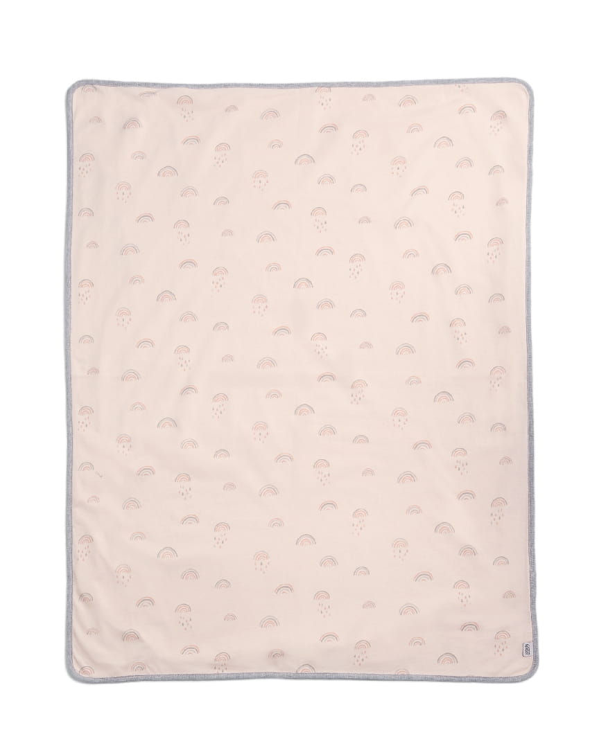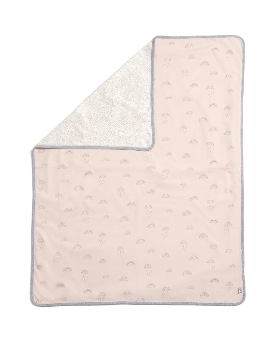 Dżersejowy koc Tęczowy Mamas&Papas jest idealny do otulania i przytulania. Dwustronny nadruk z motywem tęczy oferuje dwie wersje kolorystyczne. Na jednej stronie kocyka dominują szarości z delikatnie tłoczonymi wzorami, a drugą wykonano z różowego dżerseju bawełnianego z nadrukowanymi pastelowymi tęczami z widocznymi kroplami deszczu. Brzegi kocyka starannie obramowano szarą, dzianinowa lamówką, a rogi zaokrąglono.