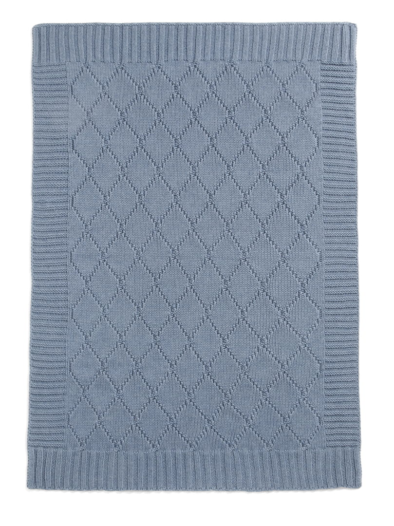 Dzianinowy kocyk Denim Blue Mamas&Papas z kolekcji Denim Blue cechuje się przyjazną dla skóry dziecka strukturą. Kolekcja Denim Blue to seria ubranek i akcesoriów zawierająca kocyki i nosidełka wykonane bardzo starannie z jeansu oraz bawełnianych dzianin w kolorze błękitnym lub ciemno niebieskim. Prezentowany kocyk wydziergano z miękkiej i delikatnej dla skóry małego dziecka bawełnianej dzianiny. Kocyk w stylowym, niebieskim kolorze uzupełni wystrój każdego pokoju, wózka czy nosidełka maluszka.