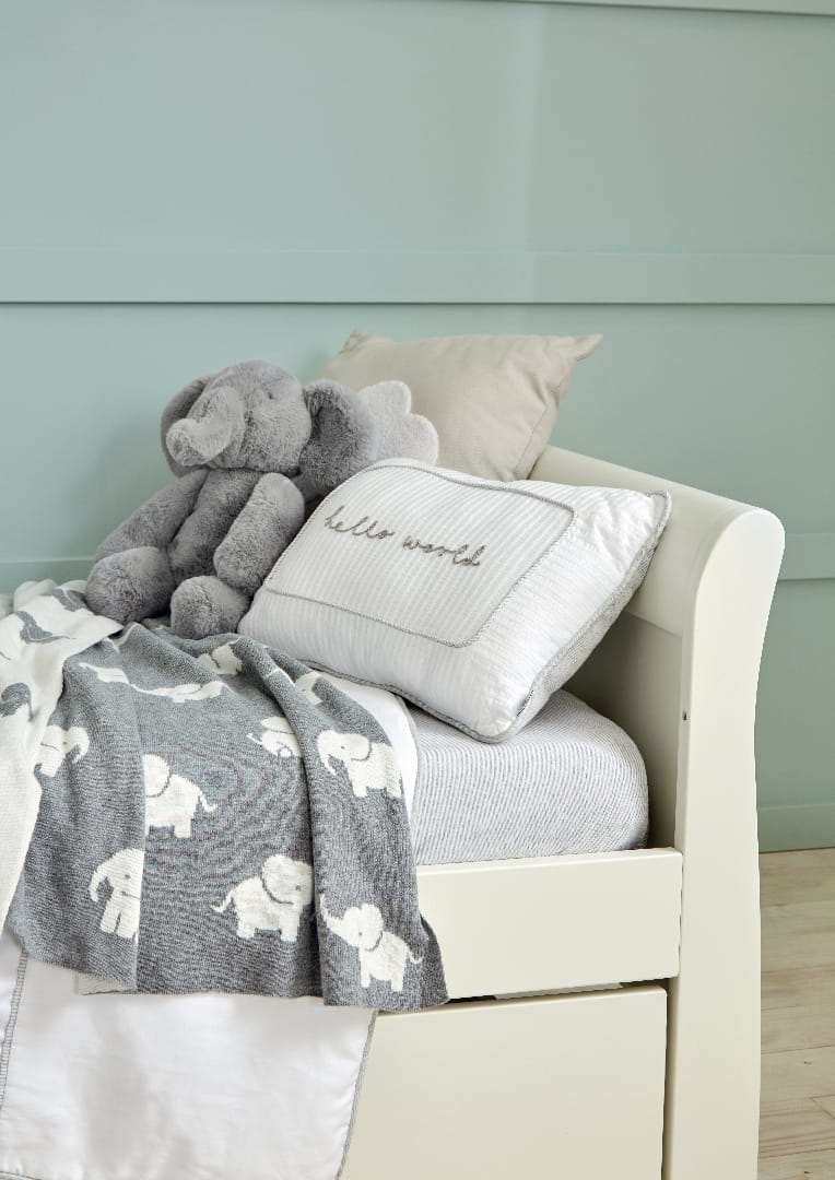 Kocyk wchodzi w skład unikalnej kolekcji Welcome to the World przedstawia zabawną postać słonia Archiego oraz kilku jego przyjaciół żyrafy i zebry. Zrealizowana w wyrazistej bieli i subtelnej szarości.