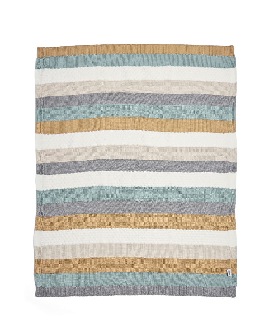 Kocyk Bawełniany Tkany Zielone Paski Mamas&Papas został starannie wykonany z wysokiej jakości bawełnianej dzianiny. Jego brzegi wydziergano splotem ściągaczowym. Pastelowe, poziome paski nadają kocykowi niepowtarzalnego wyglądu. Połączenie kolorów musztardowego, beżowego, zielonego, miętowego i ecru tworzy spójny, uspokajający obraz całości. Poszczególne paski wykonano splotem ryżowym, łańcuszkowym bądź wypukłym. Dzięki takiej różnorodności maluch może poznawać świat różnych tekstur i struktur materiałów.