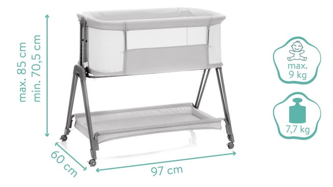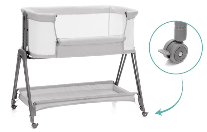 Dołączone paski zapewniają bezpieczne dopasowanie. Za pomocą kółek łóżeczko można łatwo przesuwać, a zamykając boczny panel, w ciągu dnia może służyć również jako gondola.