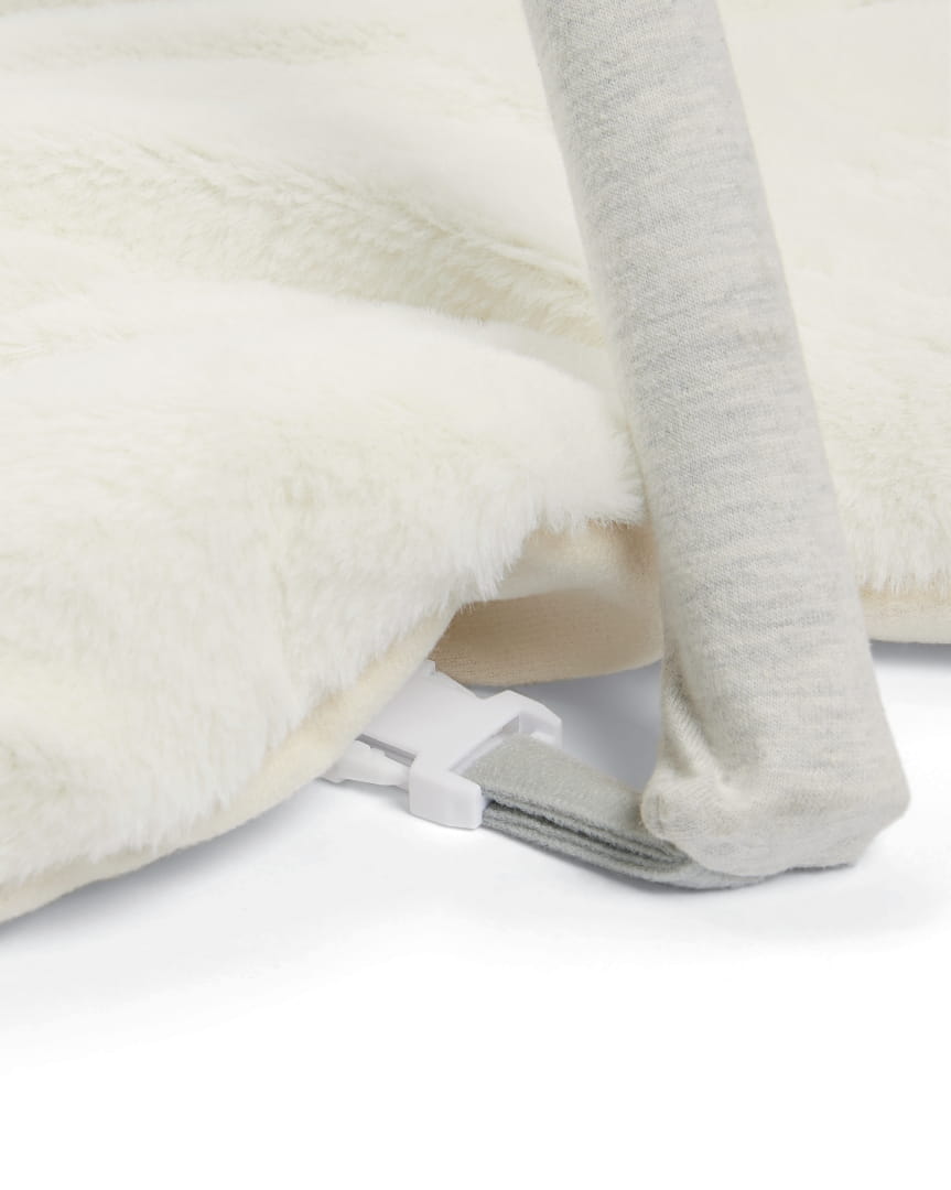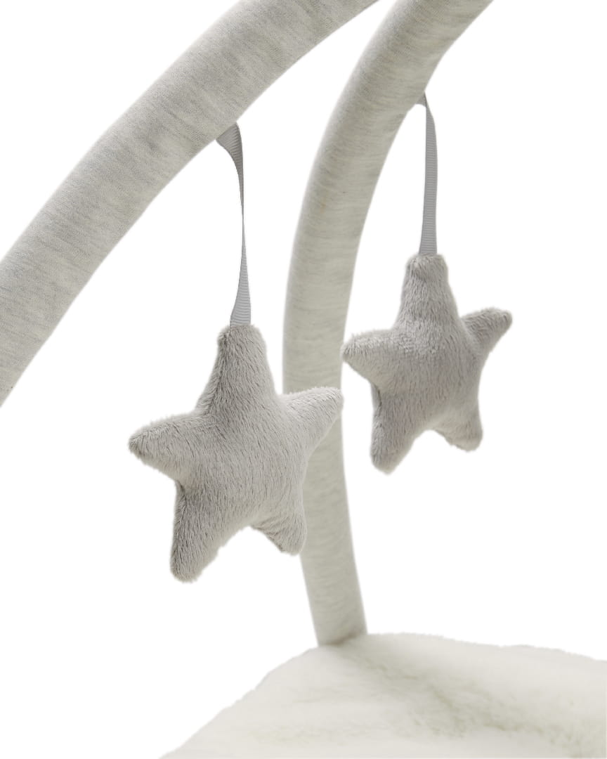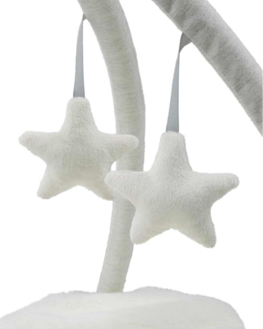 Mata edukacyjna Playmat and Gym, wykonana z miękkiej, bawełnianej tkaniny, to doskonałe miejsce do spędzania przez dziecko radosnych chwil. Wyposażono ją w dwa skrzyżowane pałąki, które można zdjąć, kiedy maluszek zaczyna siadać. Interaktywne zawieszki na pałąkach dbają o sensoryczny rozwój dziecka, pobudzając zmysły wzroku, słuchu i dotyku. Pastelowe kolory maty i pałąków, z przewagą szarości oraz delikatnej żółtej barwy, idealnie współgrają z kolorystyką kolekcji Wish Upon a Clouds. Ten model miękkiej i aksamitnie wyścielanej maty daje maluchowi możliwość samodzielnego poznawania świata i rozwijania jego wyobraźni. Na niej może wygodnie bawić się i uczyć.