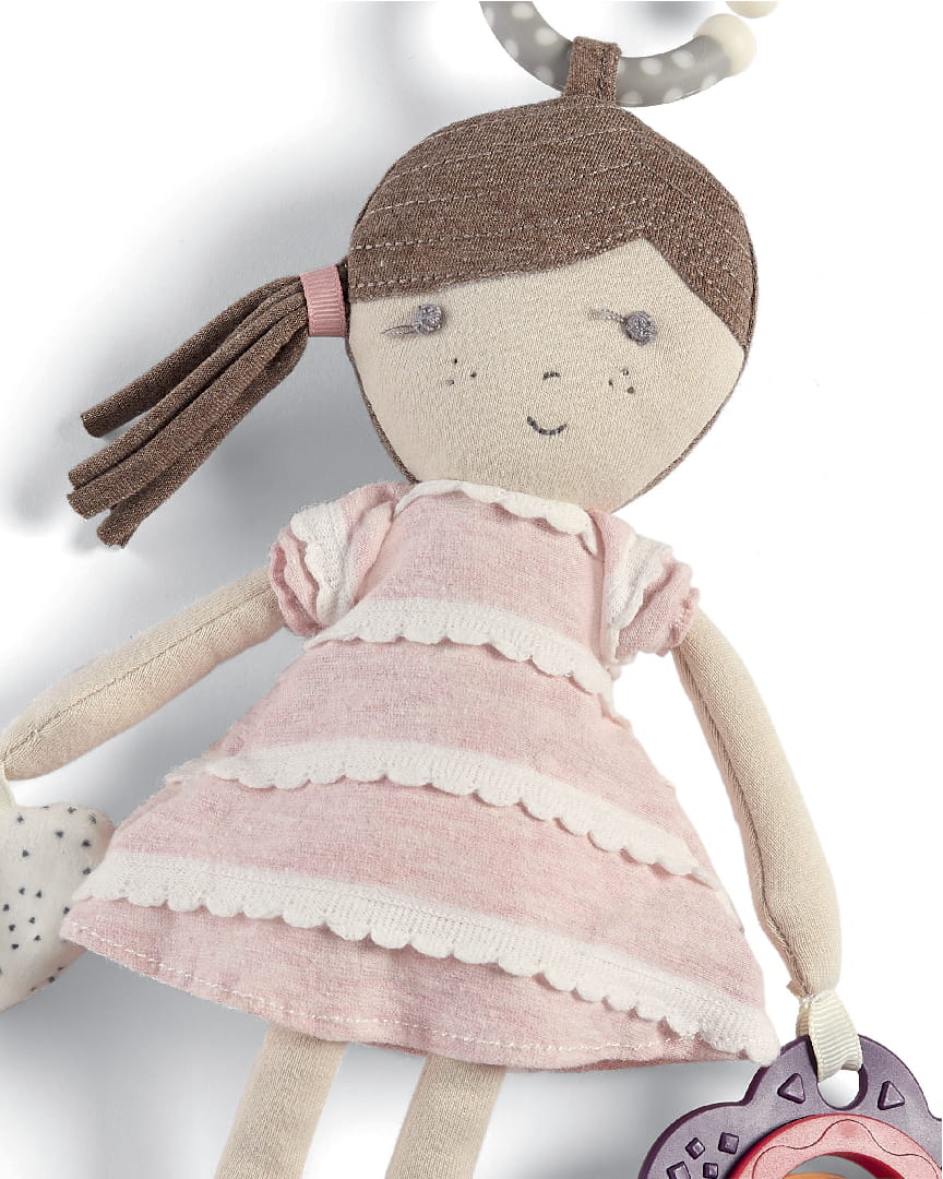 Miękka zabawka Mamas&Papas - Zawieszka Bella to niezwykle miła i miękka w dotyku zabawka, w którą Twój maluch z pewnością chętnie się wtuli. Została wykonana z delikatnej tkaniny i posiada pluszowe, przyszywane detale, wyjątkowo przyjazne dla wrażliwej skóry Twojego dziecka. Laleczka Bella została pięknie wykonana. Jest ubrana w sukienkę, buciki, a także uroczo związane włoski w kucyk. Zabawka zawiera ukryty dźwięk gongu, który aktywuje się po potrząśnięciu, lusterko w kształcie serca, dzięki któremu dzieci mogą zobaczyć siebie, oraz grzechotkę, która zapewnia jeszcze więcej zabawy. Bella jest wyposażona w poręczny C-ring, który można przymocować do fotelika samochodowego lub wózka spacerowego i może służyć jako gryzak - idealny do żucia, gdy ich dziąsła są obolałe.