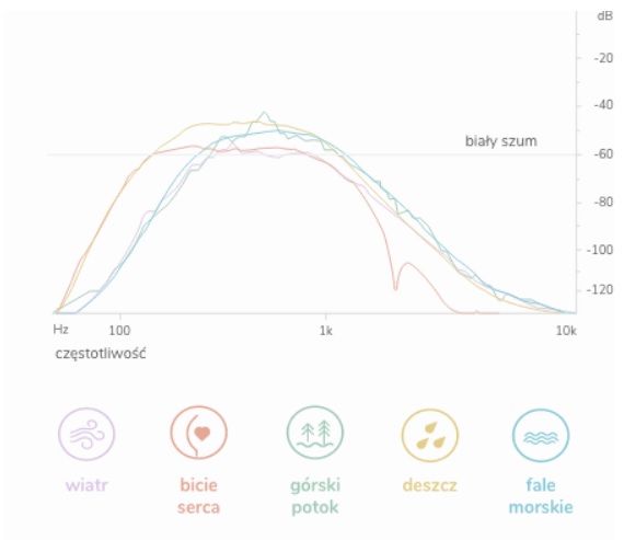 W różowym szumie moc akustyczna wysokich częstotliwość opada, dzięki czemu dźwięki o wysokich częstotliwościach są na bezpiecznym poziomie dla maluszków, a dla dorosłego są prawie niesłyszalne.