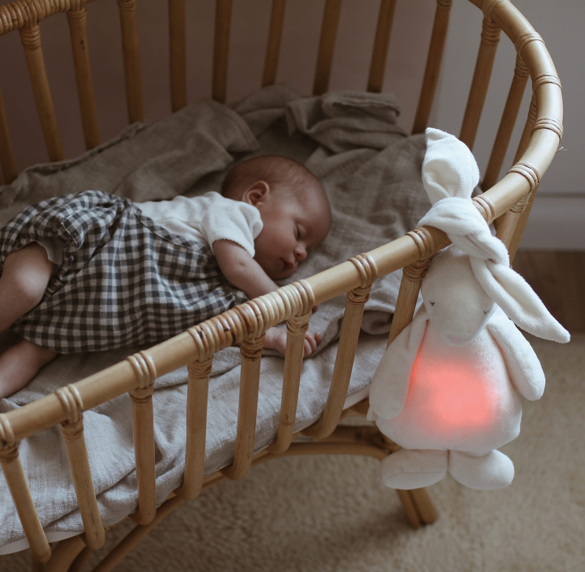 Inteligentny czujnik płaczu zapamiętuje ostatnie ustawienie szumu i światła. Można więc tak zaprogramować szumiącego króliczka MOONIE aby po ponownym uruchomieniu odtworzył ulubione ustawienia lampki i dźwięku lub samego dźwięku.