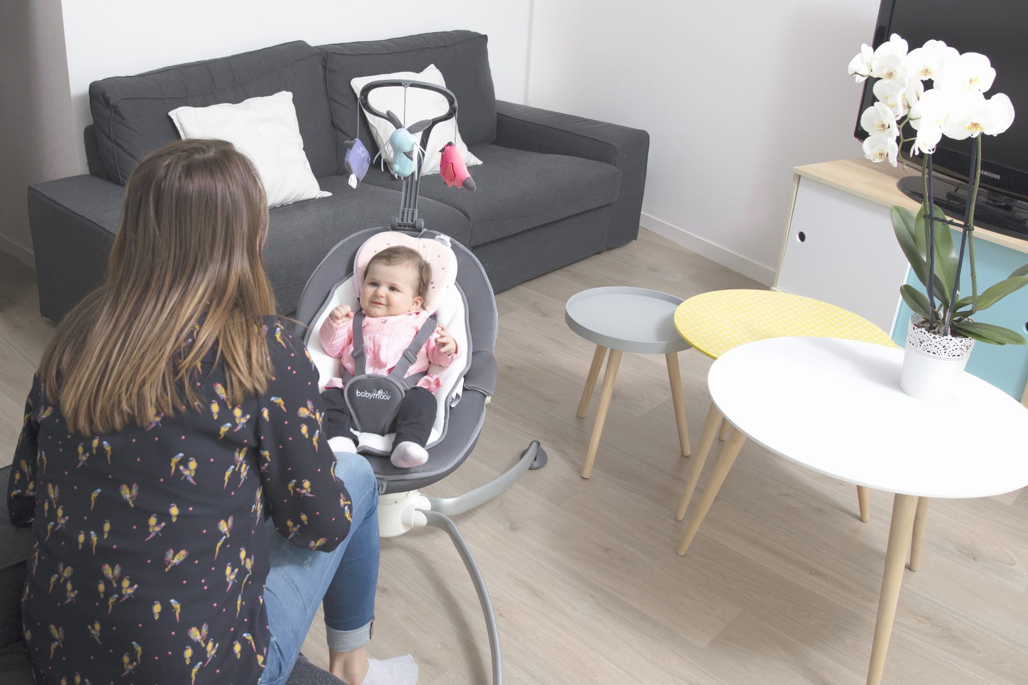 - Może być stosowany od urodzenia: pasuje do łóżka, bujaczków, huśtawek i fotelików samochodowych