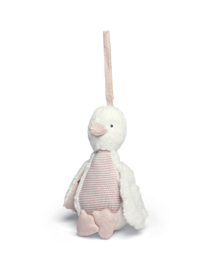 Zawieszka Mamas&Papas Różowa Kaczuszka posiada minimalistyczny design - utrzymano ją w spokojnych, pastelowych barwach w biało-różowej tonacji. Wykonana z miękkiej, bambusowej bawełny i przyjaznej dla delikatnej oraz wrażliwej skóry malucha tkaniny chambray zabawka spełnia funkcję idealnej przytulanki. W jej wnętrzu ukryto dzwoneczek, który wydaje melodyjne dźwięki przy potrząsaniu, wywołując uśmiech i rozbawienie na dziecięcej buzi.