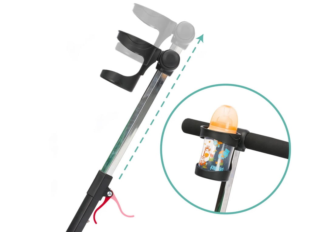 Rączka do pchania z regulacją wysokości pozwala dostosować ją do potrzeb rodziców, a zintegrowane podnóżki