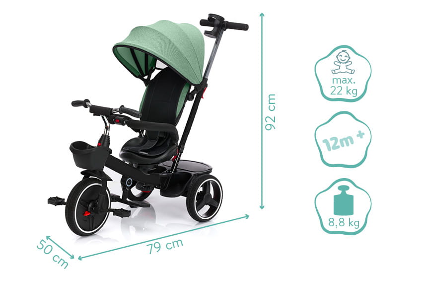 Dzięki wymiarom 79 x 50 x 92 cm (dł. x szer. x wys.) i wadze zaledwie 8,8 kg, rowerek trójkołowy Fillikid NIKI 360 Exclusive jest lekki i kompaktowy.