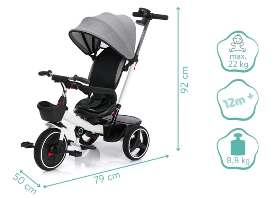 Dzięki wymiarom 79 x 50 x 92 cm (dł. x szer. x wys.) i wadze zaledwie 8,8 kg, rowerek trójkołowy Fillikid NIKI 360 Exclusive jest lekki i kompaktowy.