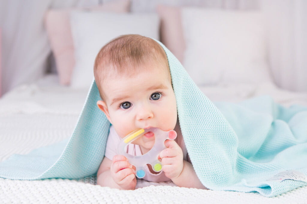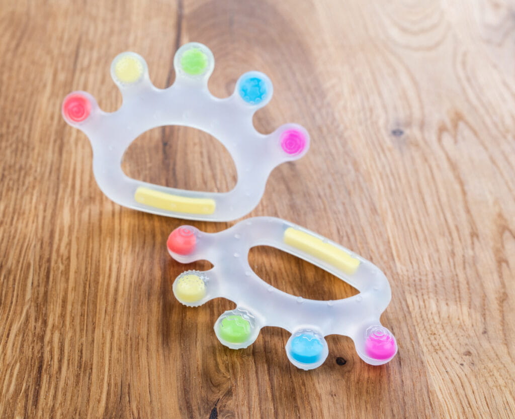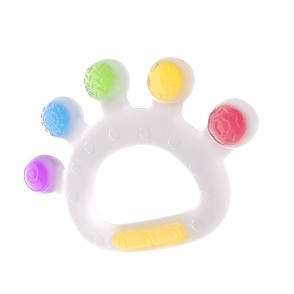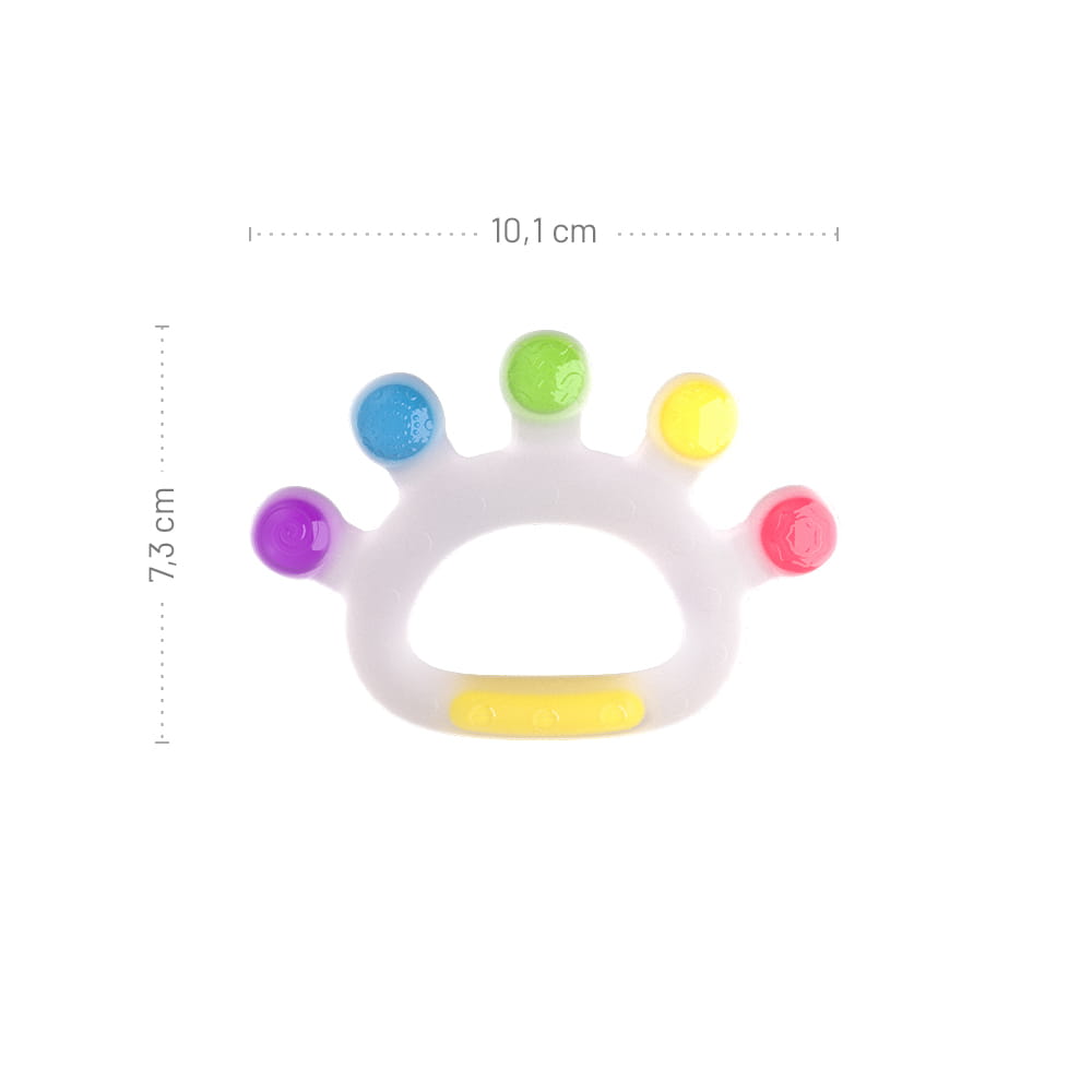 Kolorowy gryzaczek wykonany z bezpiecznego silikonu. Zdobią go wypustki o zróżnicowanym kształcie, dzięki czemu delikatnie masuje on opuchnięte dziąsełka, przynosząc maluchowi ulgę.