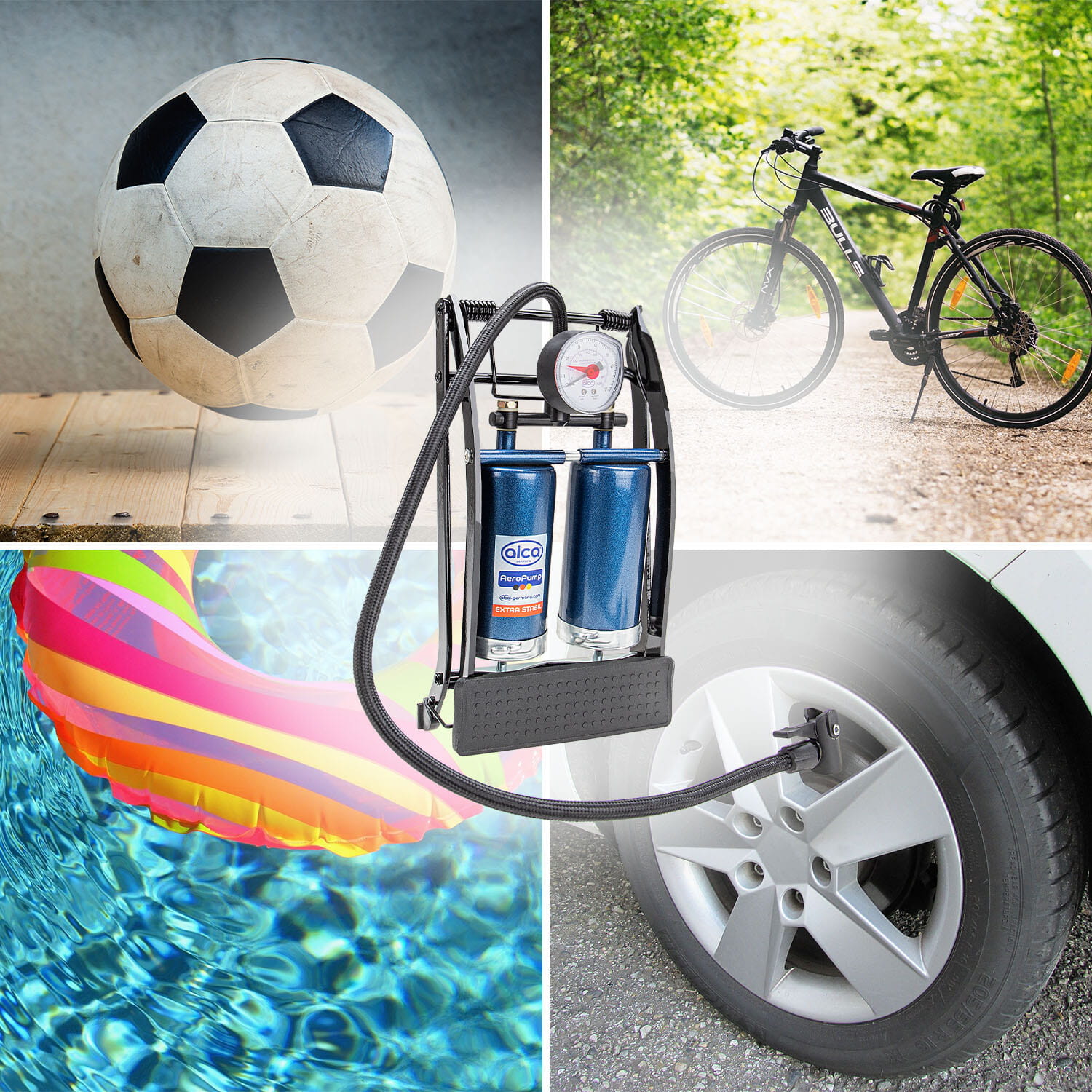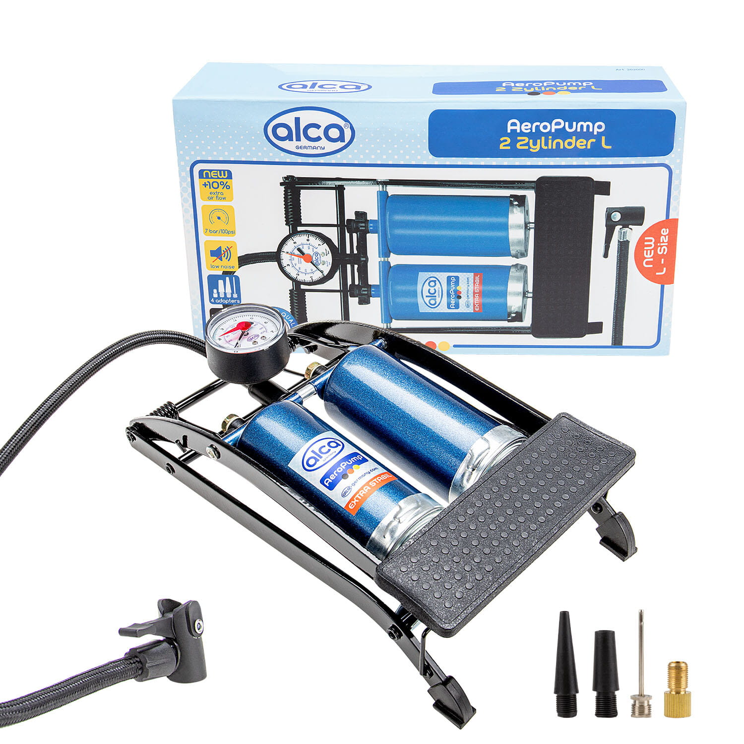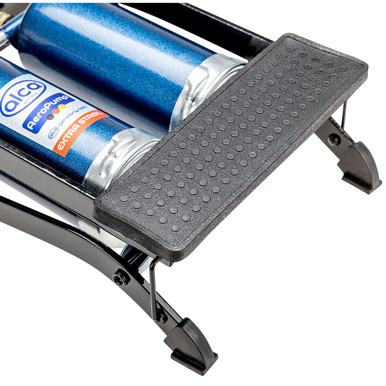 Poczuj maksymalny komfort podczas pompowania opon samochodowych, rowerów, piłek i nie tylko dzięki 2-cylindrowej, wysokowydajnej pompce nożnej alca + manometr.