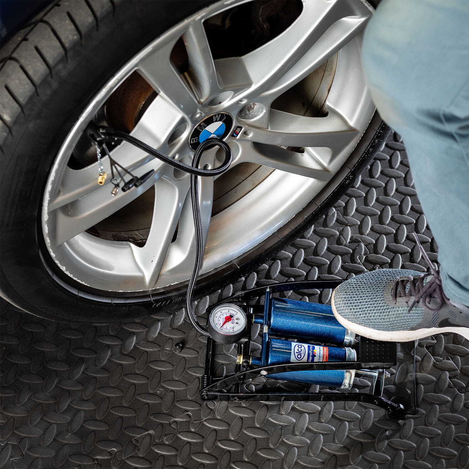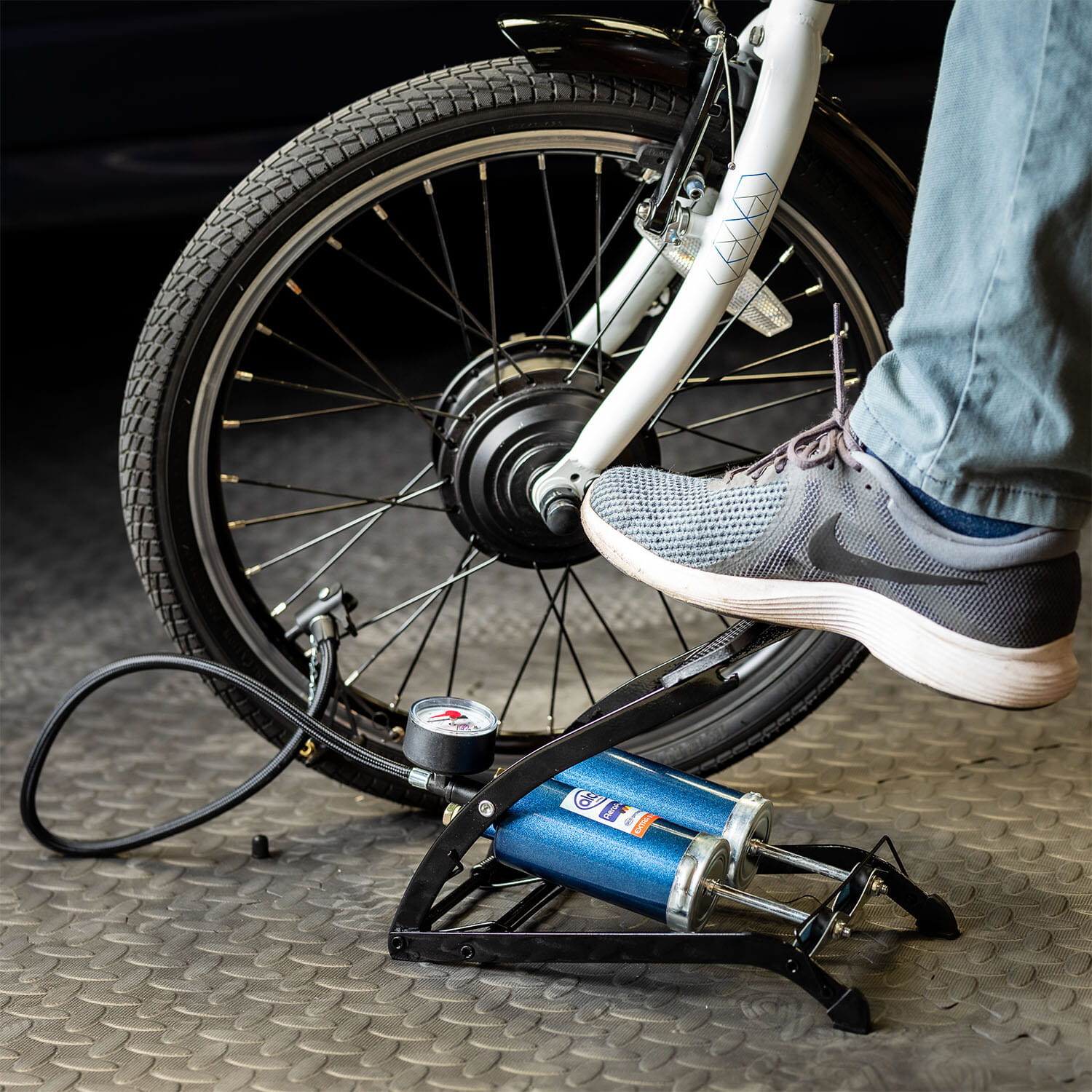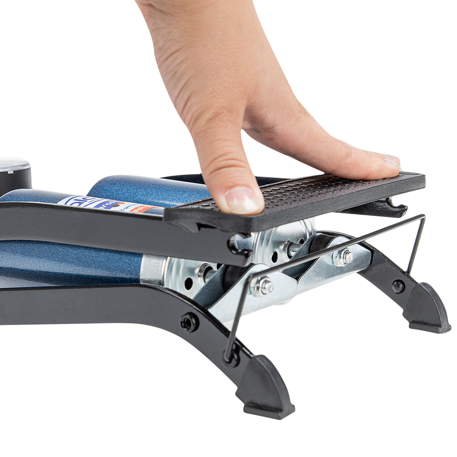 Poczuj maksymalny komfort podczas pompowania opon samochodowych, rowerów, piłek i nie tylko dzięki 2-cylindrowej, wysokowydajnej pompce nożnej alca + manometr.