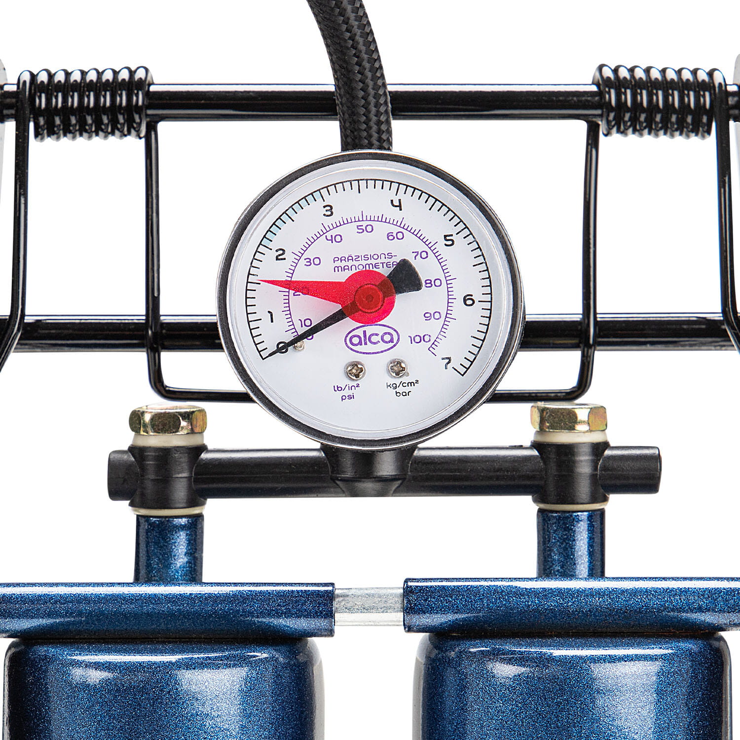 Dzięki maksymalnemu ciśnieniu wyjściowemu 7 barów, 2-cylindrowa, wysokowydajna pompa nożna alca + manometr jest idealnym rozwiązaniem dla każdego, kto potrzebuje wygodnej i mocnej pompy.