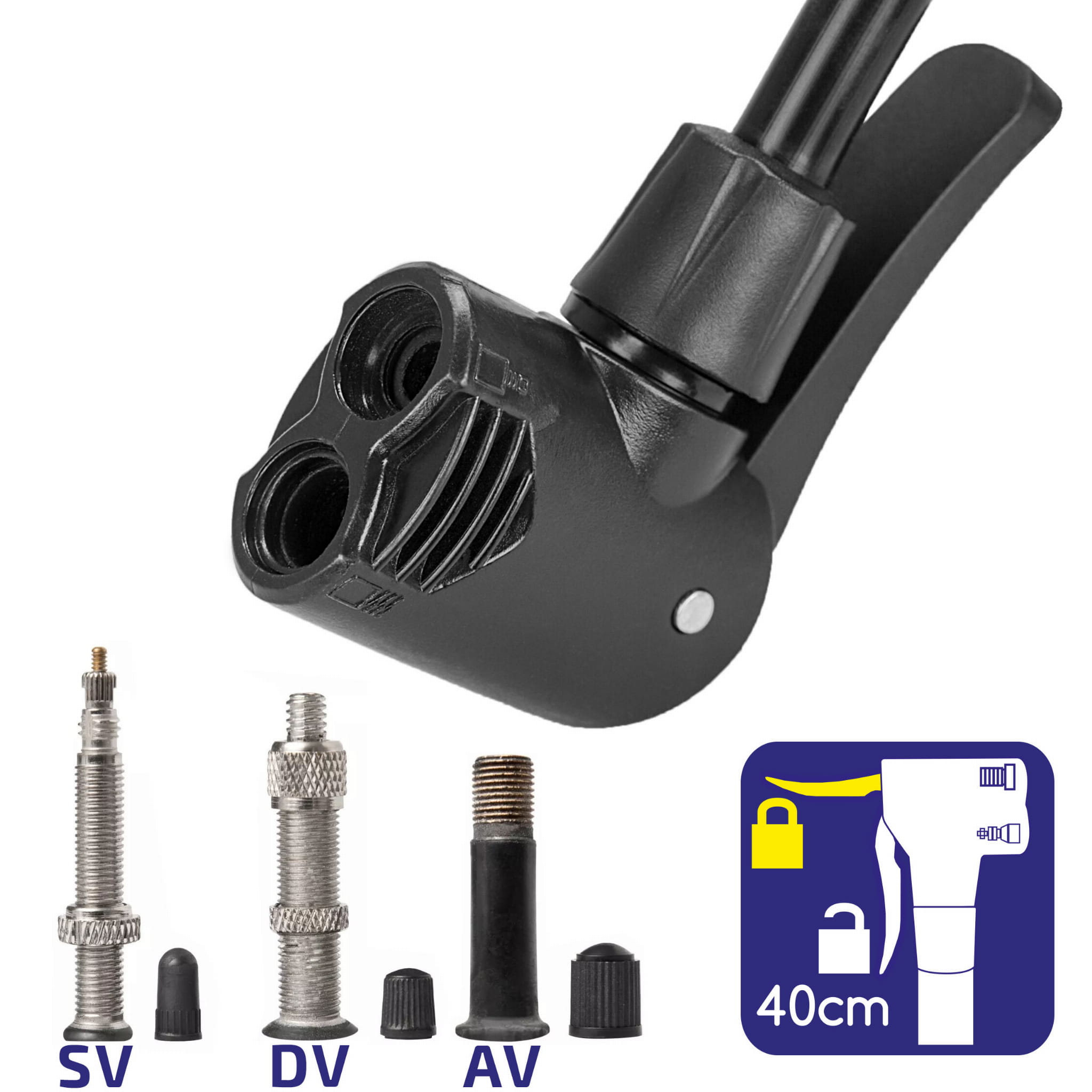 - z przyłączem do zaworów samochodowych i rowerowych (również do zaworów Dunlop, Sclaverand i Schrader)