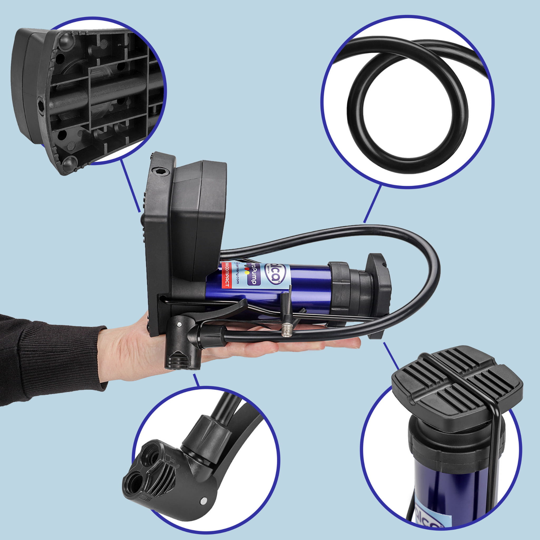 Dzięki swoim kompaktowym rozmiarom jest łatwy do przenoszenia i zabierania ze sobą, gdziekolwiek jesteś. Dzięki stabilnej podstawie możesz przyczepić pompkę w dowolnym miejscu i wygodnie sprawdzić ciśnienie w oponach.