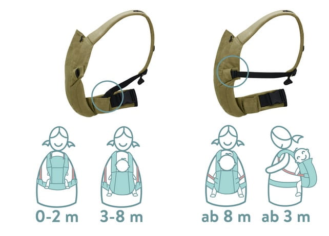 Nosidełko jest testowane pod kątem wagi dziecka w zakresie od 3,5 kg do 20 kg, dlatego zalecamy dokładne monitorowanie indywidualnego rozwoju i wielkości dziecka w różnych pozycjach noszenia. Szczegółowe opisy znajdują się w instrukcji obsługi.