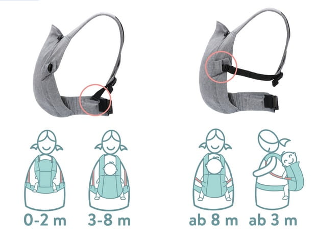 Nosidełko jest testowane pod kątem wagi dziecka w zakresie od 3,5 kg do 20 kg, dlatego zalecamy dokładne monitorowanie indywidualnego rozwoju i wielkości dziecka w różnych pozycjach noszenia.