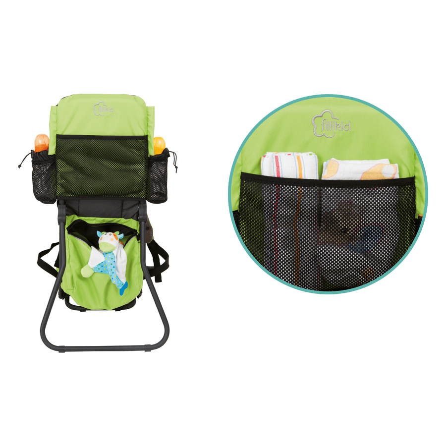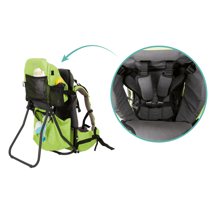 - Dobrze wyściełane, regulowane pasy bezpieczeństwa zapobiegają wypadnięciu dziecka z szelek