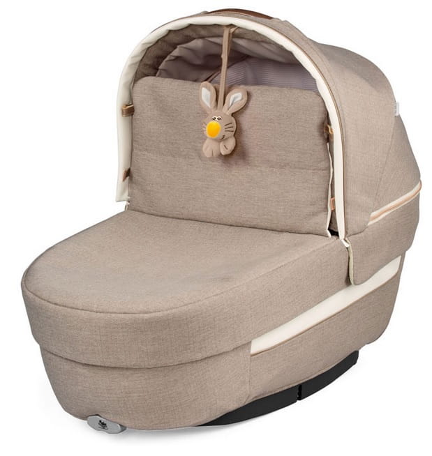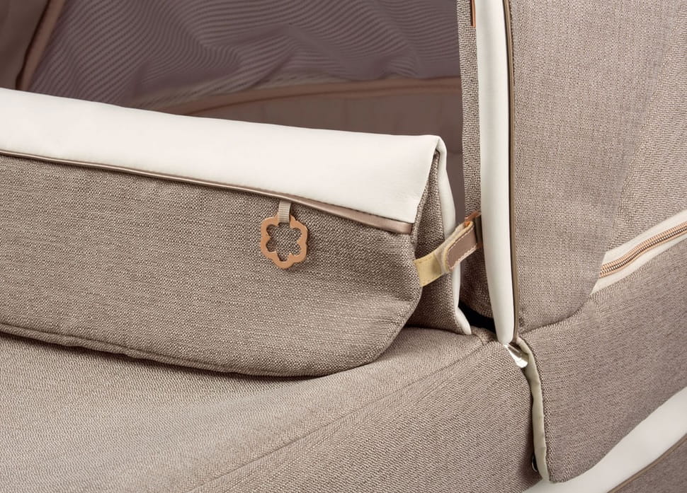 Culla Elite posiada skórzaną rączkę wbudowaną w konstrukcję budki oraz innowacyjny i opatentowany system składania budki za pomocą jednej ręki opracowany przez Peg Perego.