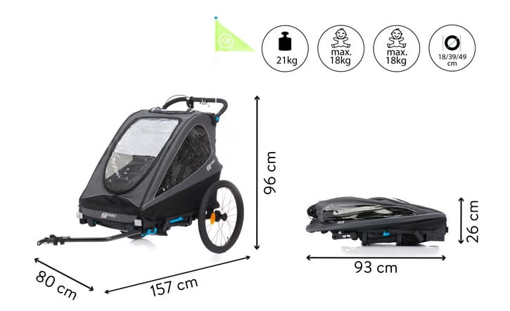 - Przyczepka rowerowa: 157 (wraz z zaczepem) x 96 x 80 cm