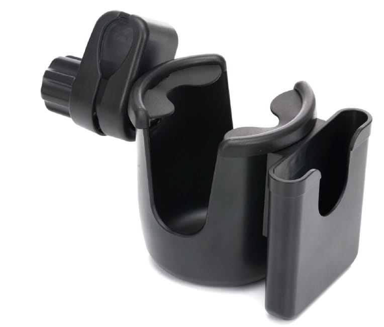 Mocowany do ramy wózka za pomocą regulowanego uchwytu, pozwala dopasować go do różnej grubości ramy wózka. Dodatkowo specjalny integrowany uchwyt na telefon, który bezpiecznie będzie zawsze pod ręką. Giętkie elementy dostosowują się do szerokości kubka lub butelki.