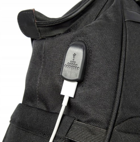 Ale trzeba też zadbać o rodziców: zintegrowany port na bocznej kieszeni umożliwia ładowanie i jednoczesne korzystanie z telefonu komórkowego.