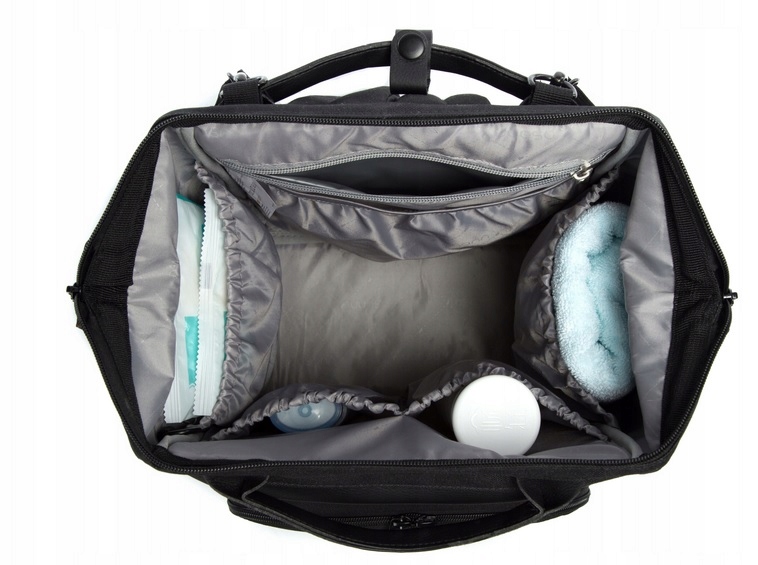 Wiele wewnętrznych i zewnętrznych kieszeni oferuje wystarczająco dużo miejsca na butelki dla niemowląt.