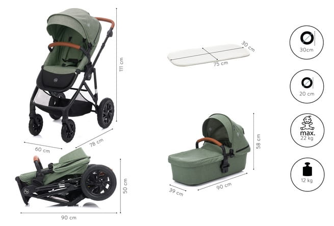 - Waga: rama 7 kg, gondola 4 kg, siedzisko spacerówki 4 kg