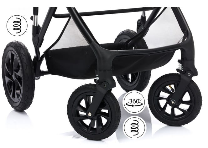 Rama i podwozie Dzięki amortyzowanej ramie i dużym pompowanym oponom wózek Leopard z łatwością poradzi sobie w każdym terenie. Przednie koła są obrotowe, co zwiększa zwrotność, a zarówno przednie, jak i tylne koła mają dodatkowe zawieszenie. Kierownica, którą można regulować w dziesięciu pozycjach, zapewnia indywidualny komfort. Kiedy nadejdzie czas parkowania, przydaje się hamulec postojowy.
