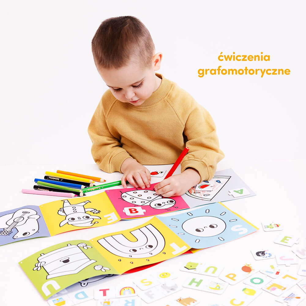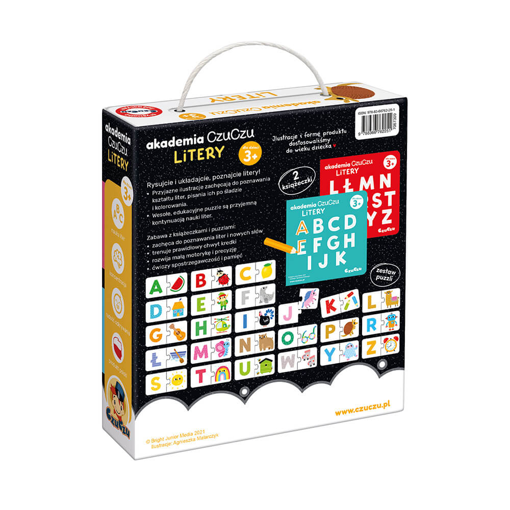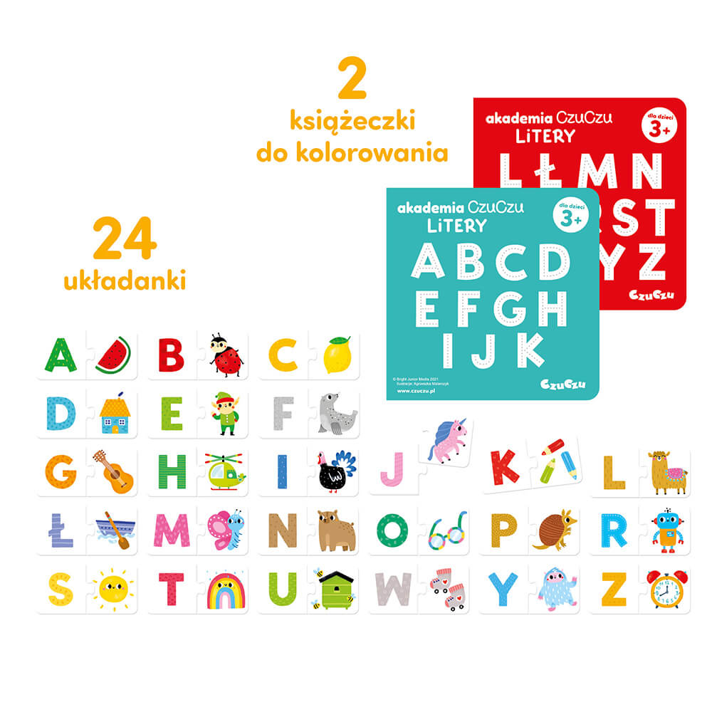 Akademia CzuCzu Litery wita! Tematyczne puzzle i kolorowanki pozwalają bawić się na różne kreatywne sposoby, które inspirują dzieci do poznawania alfabetu.