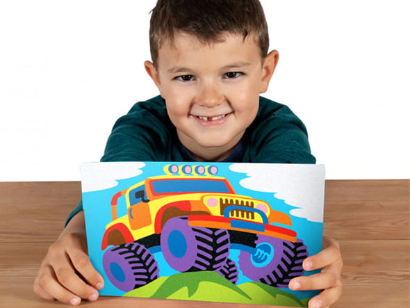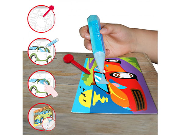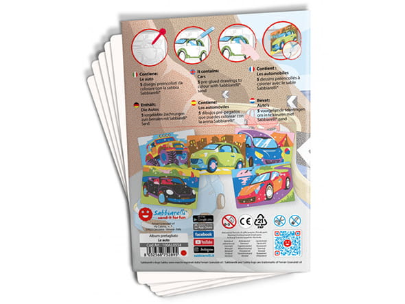 Bardzo pomysłowy, kreatywny i wyjątkowy album z super autami do kolorowania magicznym piaskiem pochodzącym ze zmielonego marmuru. Album do kolorowania piaskiem Sabbiarelli to zabawka edukacyjna przeznaczona dla dzieci, w której bezpośredni kontakt z piaskiem stanowi aspekt edukacyjny w odniesieniu do wykorzystanych materiałów. Praca z piaskiem podczas kolorowania rysunków jest nie tylko szczególnie przyjemna dla dzieci, ale również pozwala im rozwijać wyobraźnie i tworzyć piękne obrazki bez użycia nożyczek, kleju lub farb. Album do kolorowania piaskiem dla dzieci został wykonany tylko i wyłącznie z bezpiecznych i nietoksycznych materiałów. Piaskowe kolorowanki to idealny pomysł na zabawę z przyjaciółmi, a także fajny pomysł na prezent.