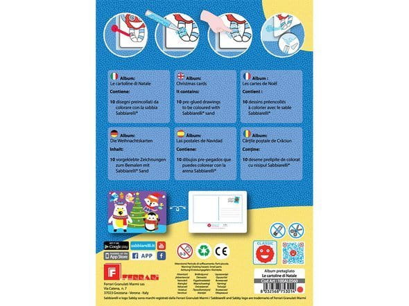 Produkt włoskiej marki Sabbiarelli która od 2012 roku rozwija i produkuje kreatywne zabawki do malowania piaskiem powstałym z marmuru ze słynnej Carrary. Te niesamowicie pomysłowe zestawy do kolorowania w 100% są wyprodukowane we Włoszech i przeznaczone dla dzieci w wieku od 3 do 12 lat. Produkty Sabbiarelli są bezpieczne, nietoksyczne i zgodne z europejskimi standardami bezpieczeństwa zabawek.