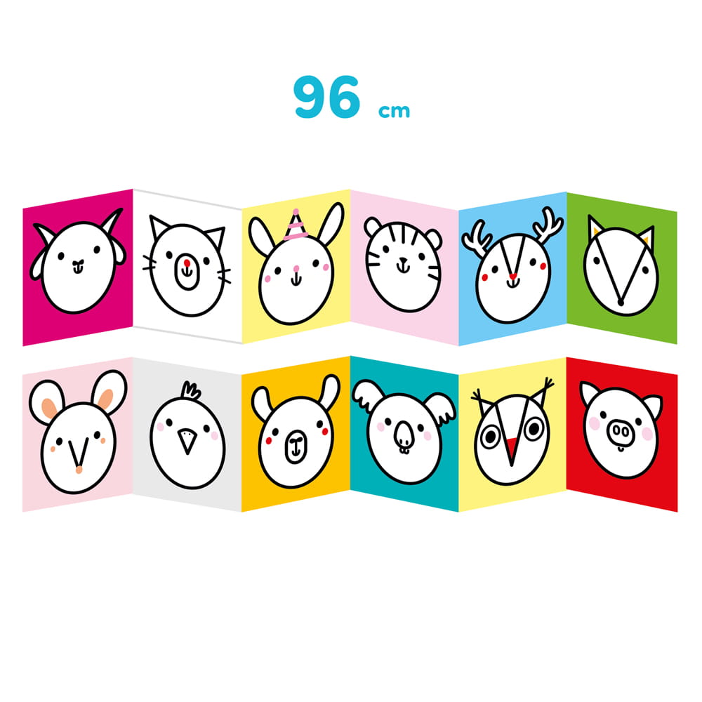 W kreatywnym zestawie znajdziecie 2 długie książeczki harmonijki, które zawierają proste ilustracje z grubymi konturami.