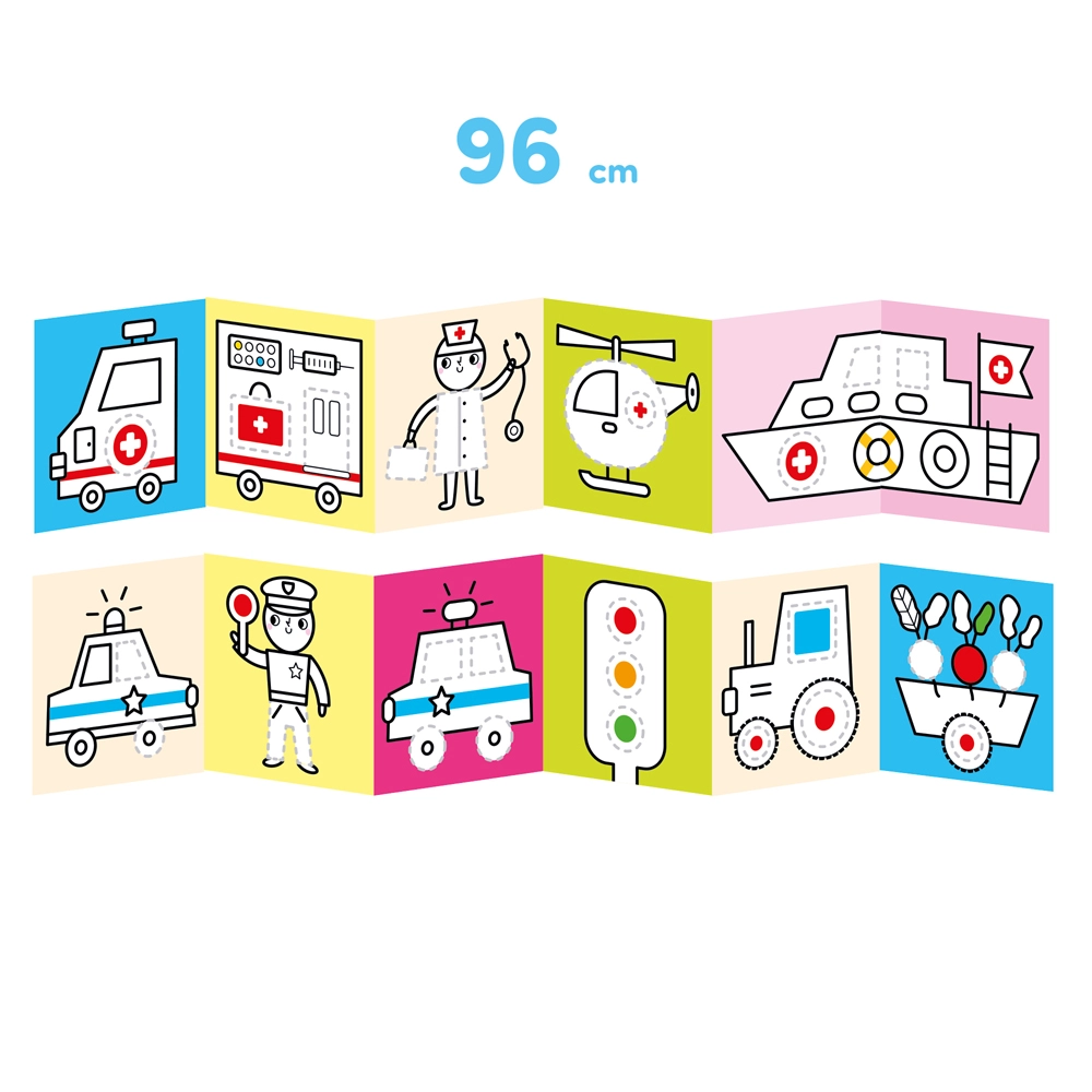 W kreatywnym zestawie znajdziecie 2 długie książeczki harmonijki, a w nich kolorowe pojazdy. Urocze ilustracje mają grube kontury i są dostosowane do wieku początkujących artystów. Lubiana przez najmłodszych tematyka zachęca dzieci do kolorowania i rysowania. Przedszkolaki potwierdzają: twórczy zestaw doskonale sprawdza się jako pierwsze kolorowanki.