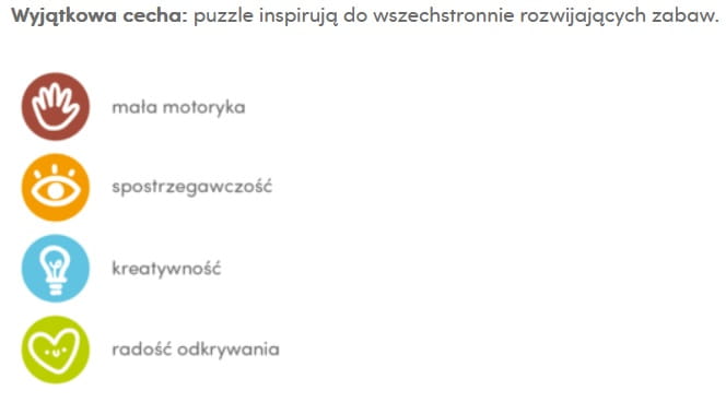 Urocze, pełne ciepła i humoru kolorowe układanki zachęcą maluchy do zabawy. Układanie puzzli to wszechstronnie rozwijające zajęcie. Wyszukiwanie i łączenie połówek pozwala doskonalić spostrzegawczość, logiczne myślenie i sprawność rączek w bardzo wesoły sposób.