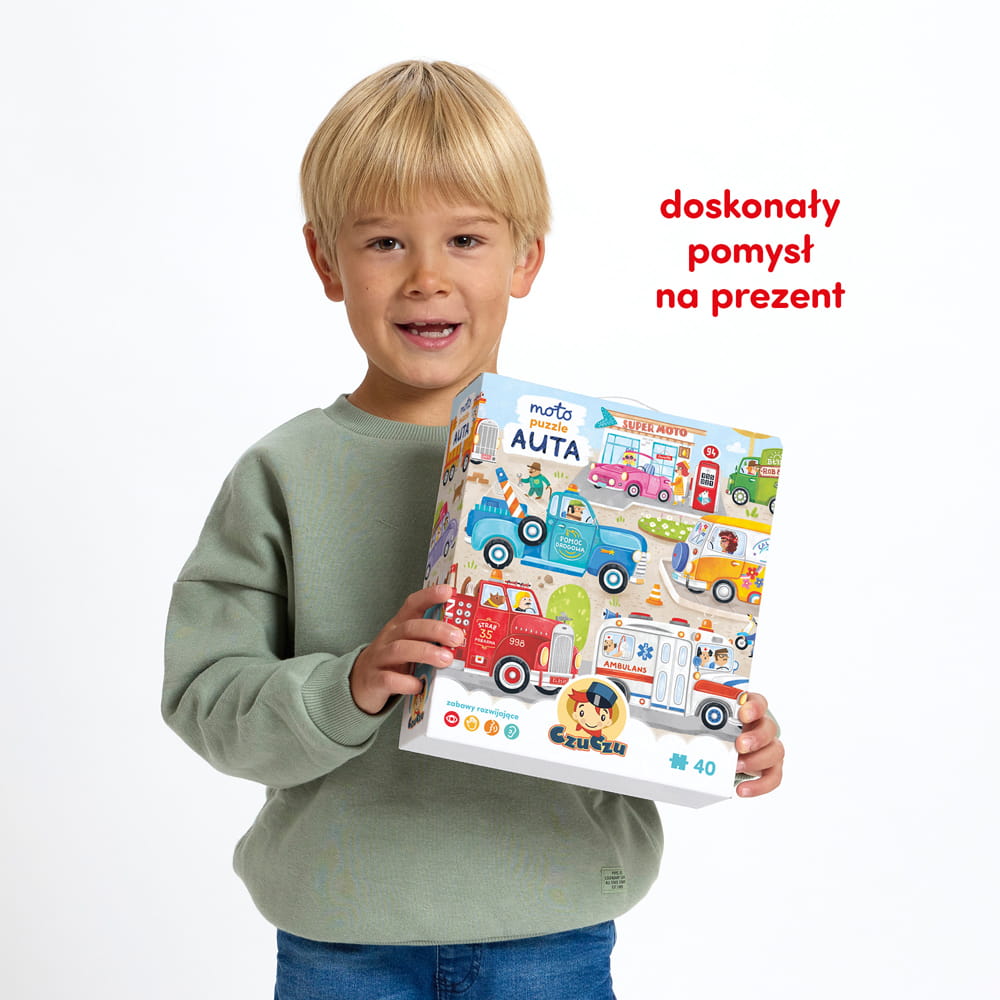 Ciekawy świata przedszkolak nieustająco doskonali swoje umiejętności i poszerza wiedzę, co w naturalny sposób przychodzi mu przez zabawę. Ma też swoje zainteresowania, a jednym z nich są ulubione pojazdy: samochody, ciężarówki, wozy strażackie, karetki, śmieciarki… Doskonale to rozumiemy, dlatego Moto puzzle Auta zgromadziły wszystkie ulubione wozy znalazły się na jednej ilustracji!