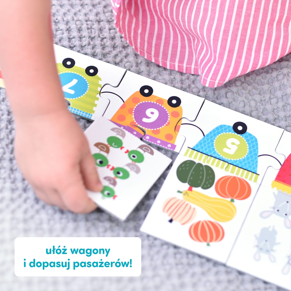 Aby długi i kolorowy pociąg wyruszył ze stacji, ułóżcie wagony we właściwej kolejności i dopasujcie odpowiednią liczbę pasażerów i towarów. Układajcie puzzle, poznając przy tym cyfry i uczcie się liczyć do 10. Puzzle to doskonały pomysł na prezent dla ciekawego świata przedszkolaka. Dzieci potwierdzają: liczenie to świetna zabawa!