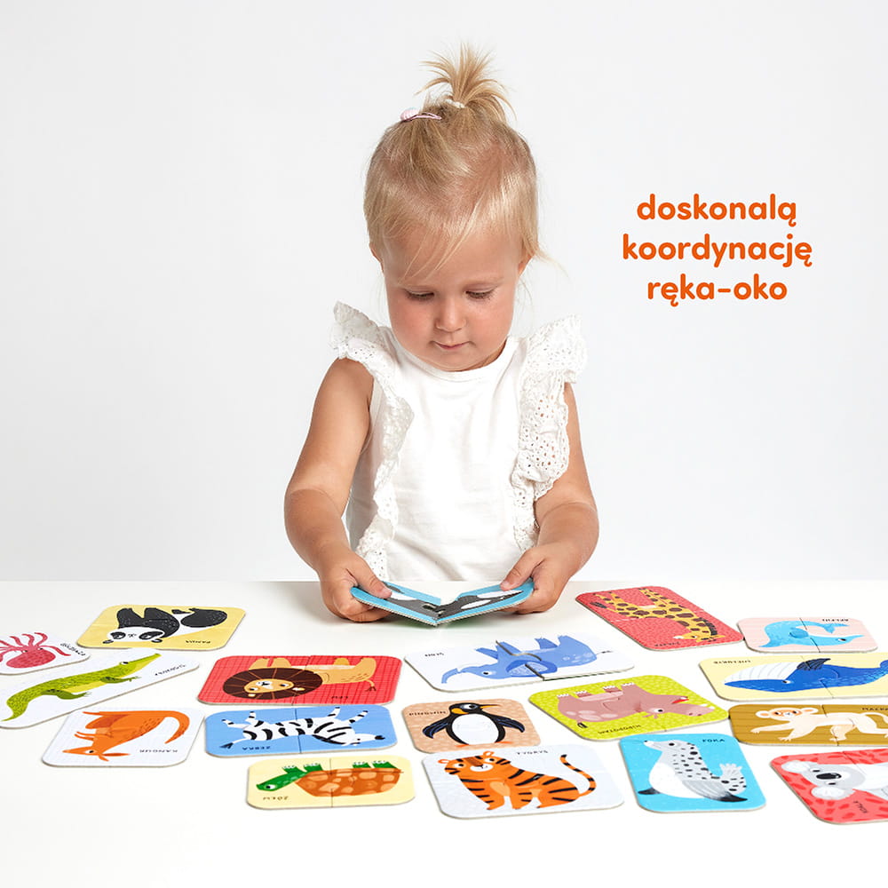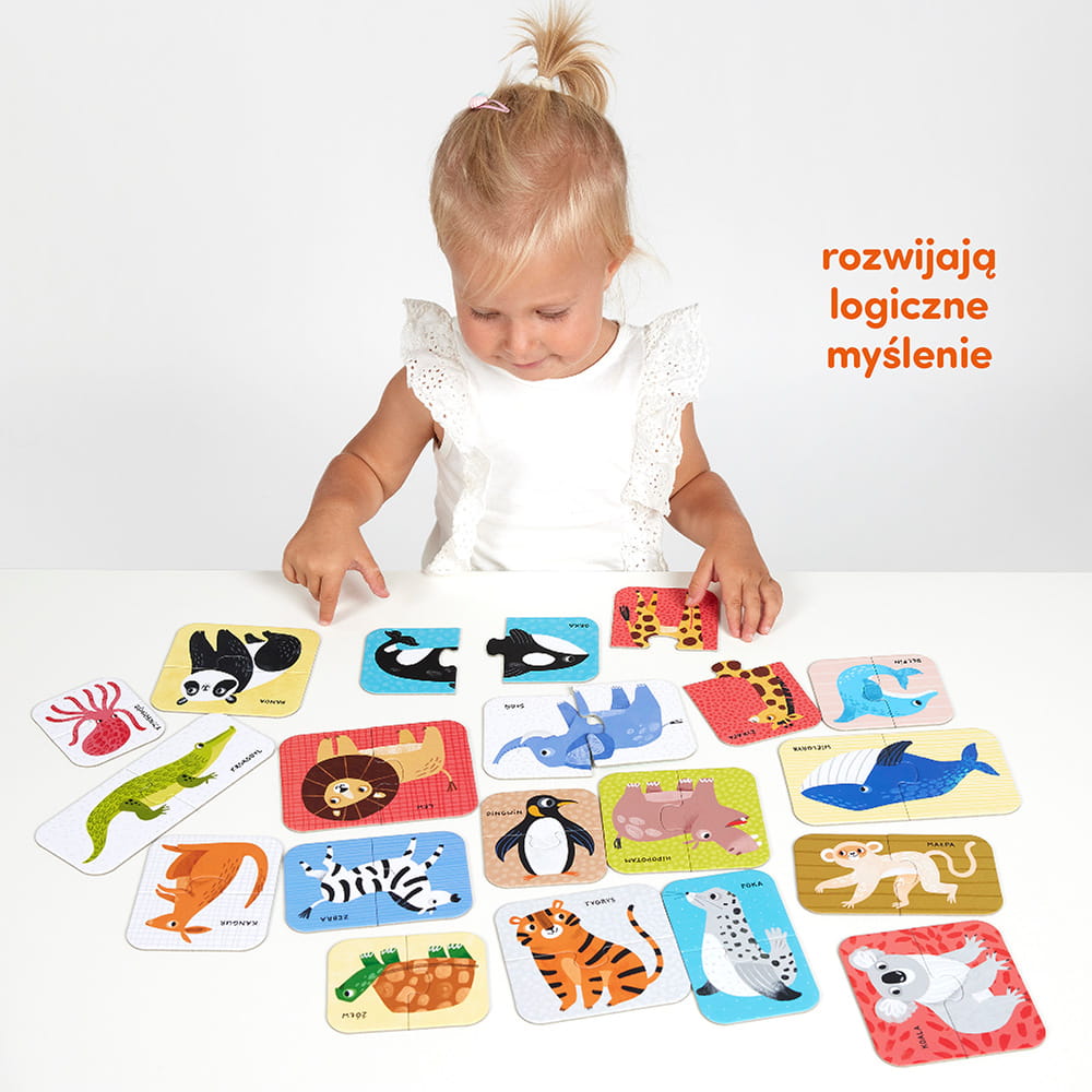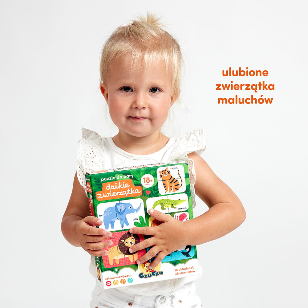 Edukacyjny zestaw składa się z 18 dużych układanek. Znakomicie sprawdzą się jako pierwsze puzzle z tradycyjnymi łączeniami lub kolejny zestaw w kolekcji. Piękne ilustracje przedstawiają dzikie zwierzątka z różnych zakątków globu. Maluchy je uwielbiają! Zabawa z puzzlami pozwala rozwijać koordynację ręka-oko, bystre oko i inspiruje do poznawania nowych słów i zdobywania wiedzy. Dzika zabawa start!