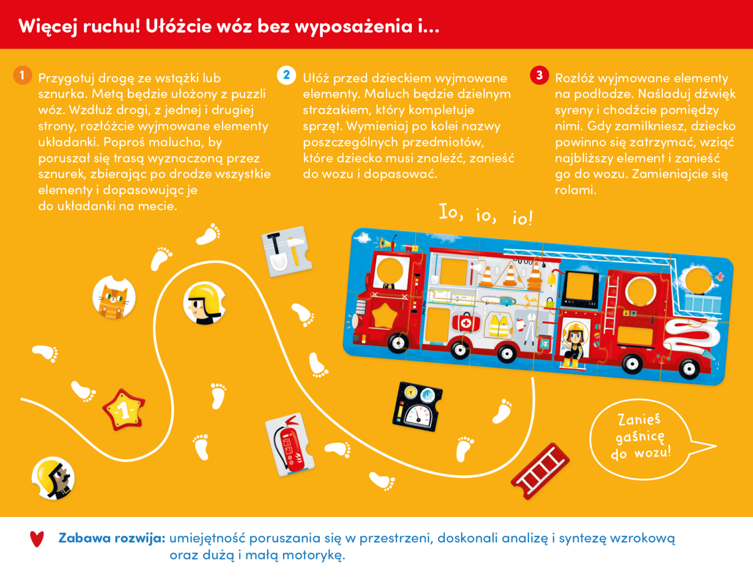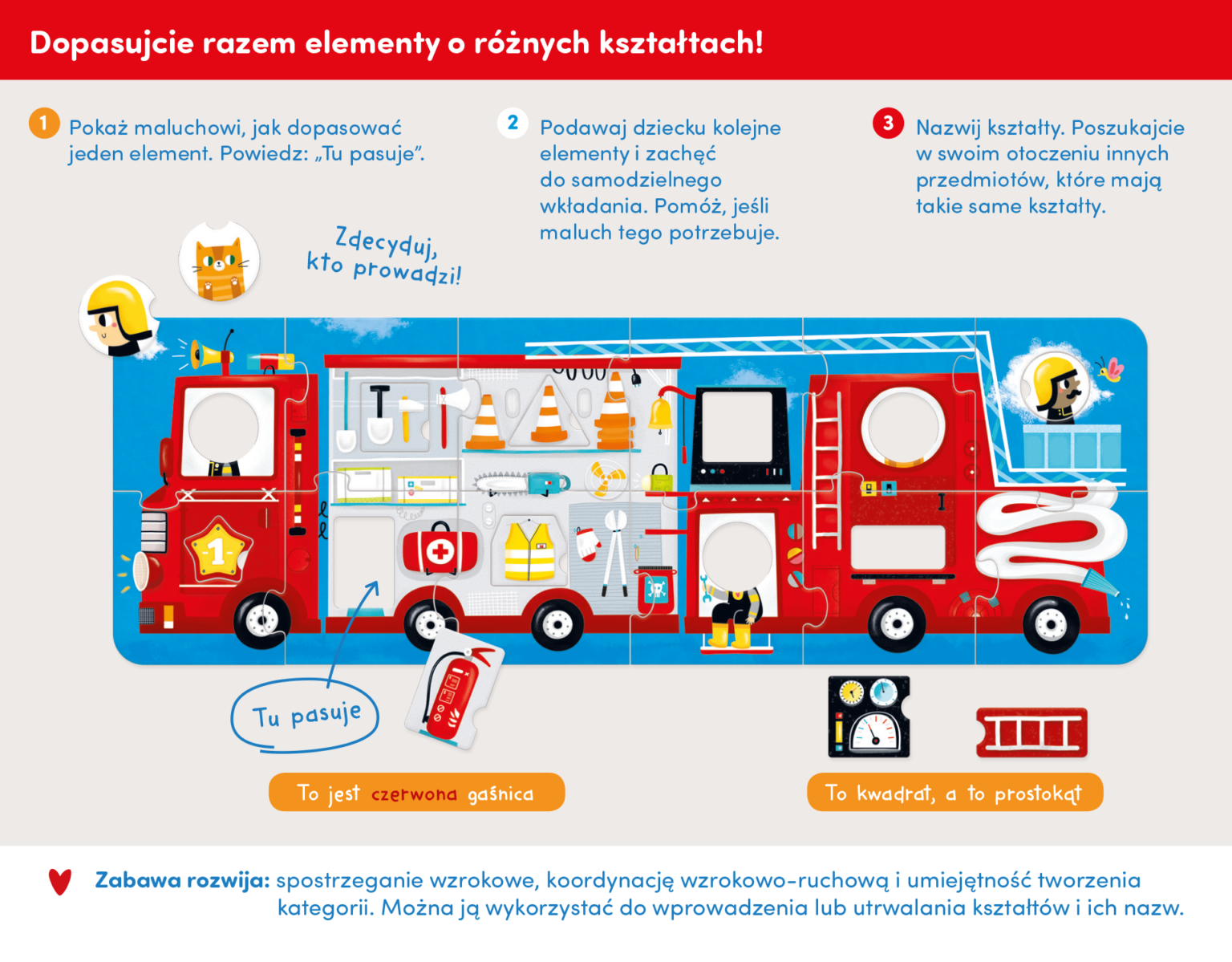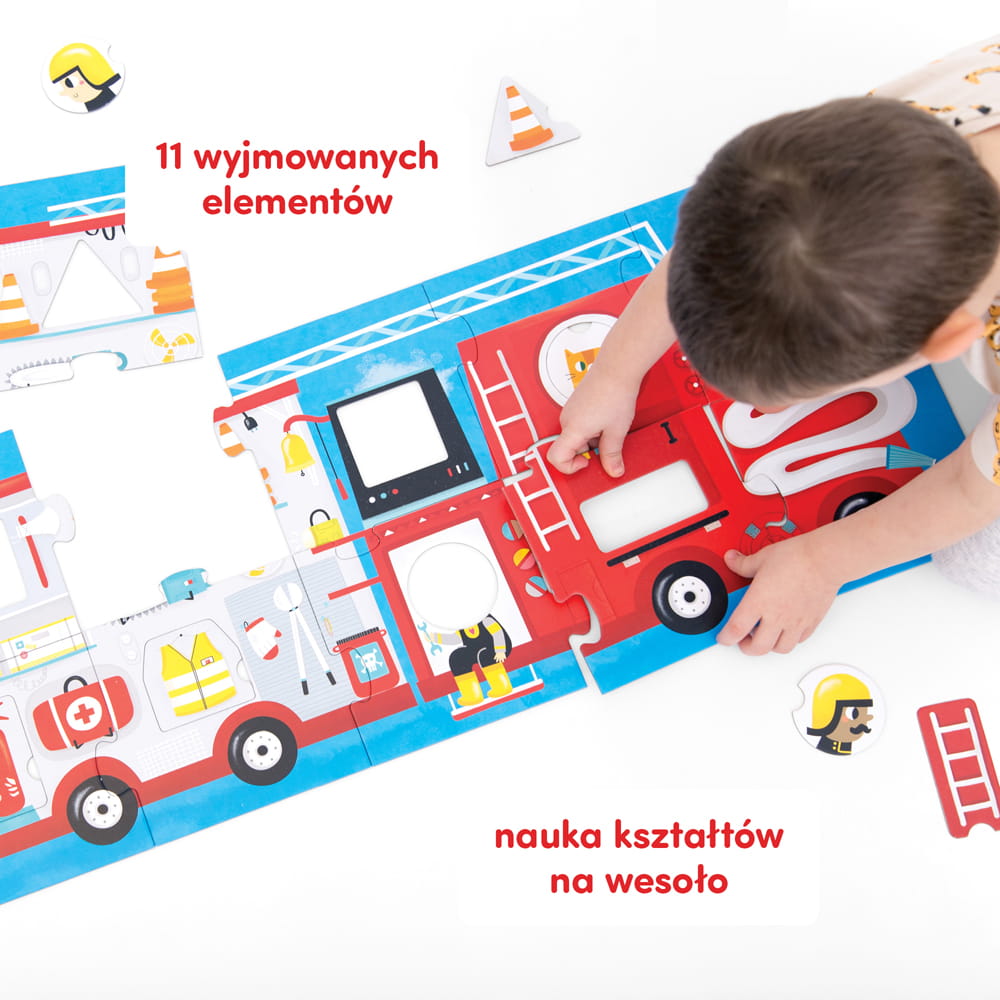 Kolorowa, wielka panoramiczna układanka przedstawia w pełni wyposażony wóz strażacki i jego dzielną załogę. Oprócz tradycyjnych puzzli ma także wyjmowane elementy, które należy dopasować do odpowiednich dziurek o różnych kształtach. Znakomicie sprawdzi się jako pierwsze wieloelementowe puzzle dla maluchów, nie tylko wielbicieli straży pożarnej.