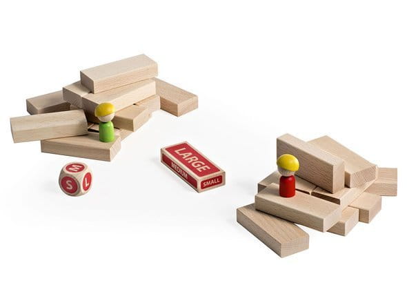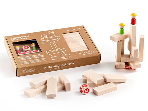 Instrukcja: Jak zbudować szalony pałac? Umieść czerwony klocek z napisami po środku miejsca przeznaczonego na grę. Będzie bazą dla pałacu. Rzuć kostką „architekta” i umieść jeden z drewnianych klocków w dowolnym miejscu „bazy” lub na innym już ustawionym klocku. Sposób w jaki należny ustawić klocek określa kość: - jeśli wyrzucisz S - ustaw klocek pionowo; - jeśli wyrzucisz M - ustaw klocek na boku; - jeśli wyrzucisz L - połóż klocek na płasko. Za każdym razem, gdy umieszczasz element, postaw na nim swoja mała figurkę. Uważaj: jeśli zburzysz pałac lub spadnie chociaż 1 klocek, przegrasz! Kiedy wszystkie elementy zostaną ułożone, zwycięzcą zostanie gracz, którego mała figurka znajduje się w najwyższym punkcie pałacu! - Pełna instrukcja gry znajduje się w pudełku. Produkt włoskiej marki Milaniwood która od 1924 roku tworzy bardzo kreatywne, wyjątkowe i niebanalne gry drewniane wykonane z certyfikowanego drewna FSC™. Gry Milaniwood są certyfikowane, bezpieczne i przeznaczone dla całej rodziny. Wyprodukowane w 1000% we Włoszech i w zgodzie z europejskimi standardami bezpieczeństwa zabawek.