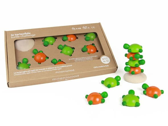 Instrukcja: WYŚCIG ŻÓŁWI (2 graczy.) Każdy z dwóch graczy wybiera swój kolor żółwi. Można grać na podłodze lub na stole, wszystko czego potrzeba to płaska powierzchnia. Można wyznaczyć przestrzeń gry za pomocą książek, pudeł lub innych przedmiotów. Podobnie jak w kręglach, należy ustalić, z której linii żółwie starują. Odległość od linii do skały powinna wynosić co najmniej 70/80 cm. Im dalej, tym większe wyzwanie. Należy ustalić w jaki sposób gracze będą przesuwać żółwie – czy delikatnie pstrykając jak w grze w kapsle, czy popychając przy użyciu np. linijki, grzebienia, patyczka, czy podrzucając. Ruch wykonywany jest naprzemiennie przez graczy, kolejnymi żółwiami z ich puli. Najpierw jeden gracz później drugi. W trakcie gry, skały nie można dotknąć ani przesunąć. Podobnie, nie można dotknąć żółwia, który jest już na trasie. Jeśli żółw się przewróci, wypada z gry, ale pozostaje na polu gry do końca. Jeśli inny żółw potraci go i obróci we właściwy sposób, wraca do wyścigu. Po zagraniu wszystkich żółwi zwycięzcą zostaje gracz, którego żółw jest najbliżej skały. WIEŻA ŻÓŁWI (minimum 2 graczy). Do gry potrzebna jest płaska równa powierzchnia (stół, podłoga itp.). Należy umieścić na niej skałę, będzie podstawą wieży z żółwi. Można położyć ją płaska strona w górę lub w dół, w zależności od tego, jak trudna ma być gra. Najmłodszy gracz rozpoczyna. Każdy z graczy w swojej turze stara się umieścić kolejno wszystkie 8 żółwi jeden na drugim na skale. Żółwie można układać normalnie i odwrócone. Gdy chociaż jeden żółw spadnie, należy policzyć ile żółwi zostało w wieży i następny gracz podejmuje wyzwanie. Zwycięzcą zostaje gracz, który ułoży najwięcej żółwi, zanim spadną. Produkt włoskiej marki Milaniwood która od 1924 roku tworzy bardzo kreatywne, wyjątkowe i niebanalne gry drewniane wykonane z certyfikowanego drewna FSC™. Gry Milaniwood są certyfikowane, bezpieczne i przeznaczone dla całej rodziny. Wyprodukowane w 1000% we Włoszech i w zgodzie z europejskimi standardami bezpieczeństwa zabawek.