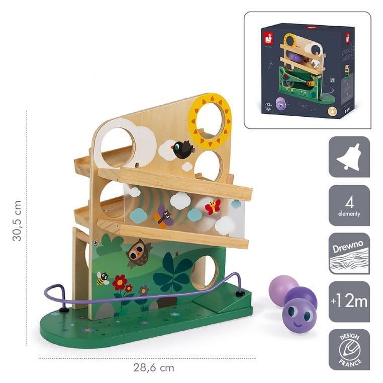 Przy dolnej platformie rampy znajduje się dzwoneczek, którego przyjemny dźwięk informuje dziecko, że piłeczka dotarła do celu. Przeźroczysta ścianka wzdłuż jednej z platform rampy oraz metalowa barierka u jej podstawy zapobiegają dalszemu wypadnięciu piłeczek z toru, dzięki czemu nie gubią się w trakcie zabawy.