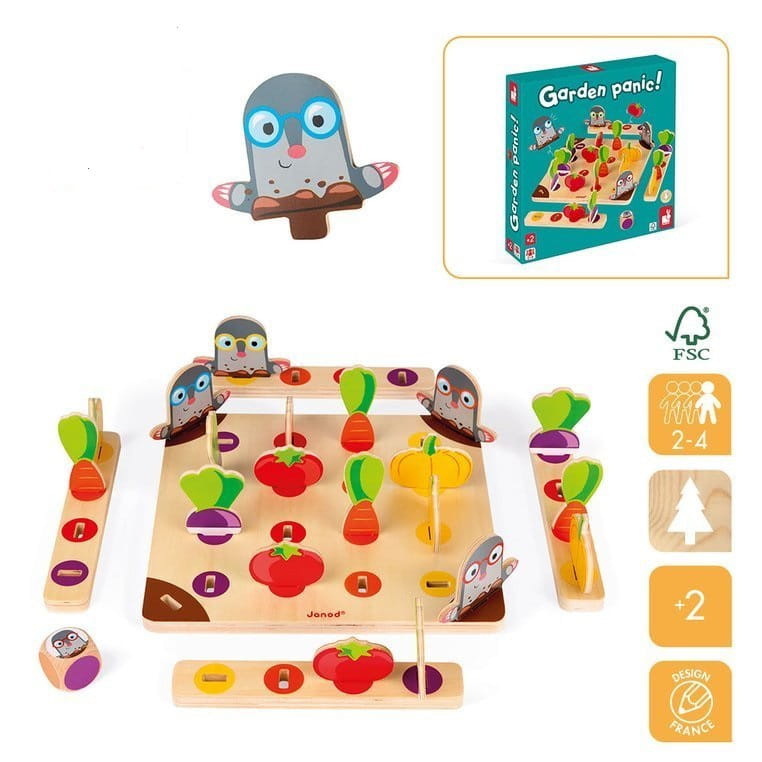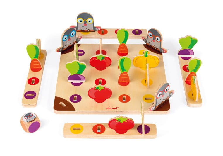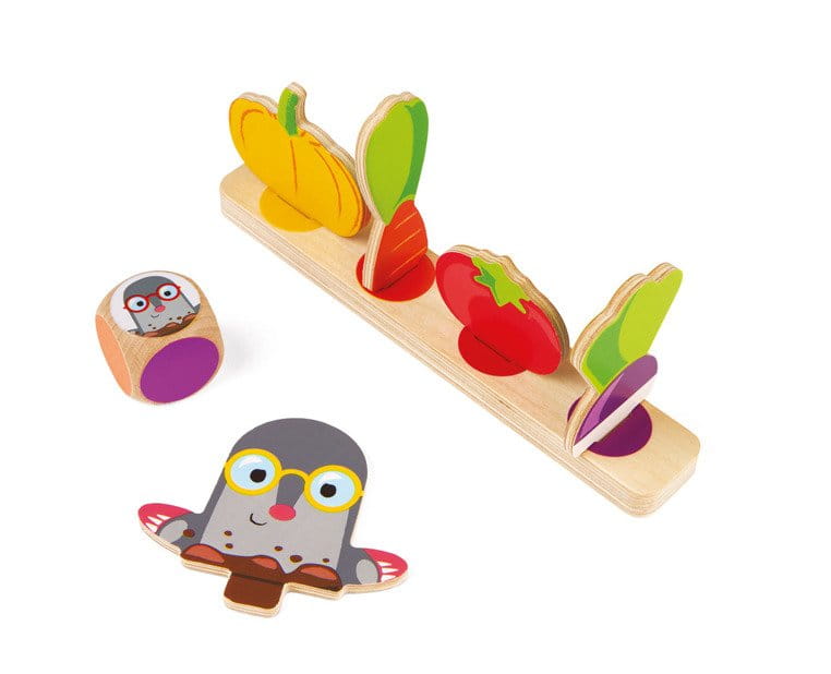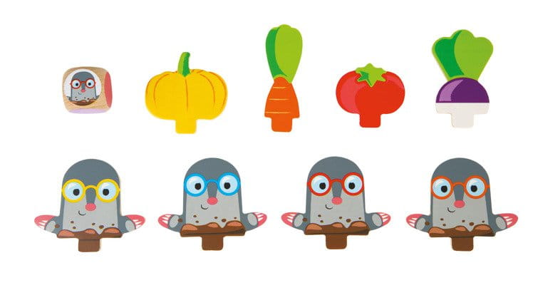Zestaw zawiera drewnianą planszę, podkładki i elementy, które się na nich umieszcza, tj. 4 krety oraz po 4 sztuki warzyw: rzepy, pomidorów, marchewki i dyni, tworzących mały ogródek.