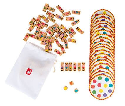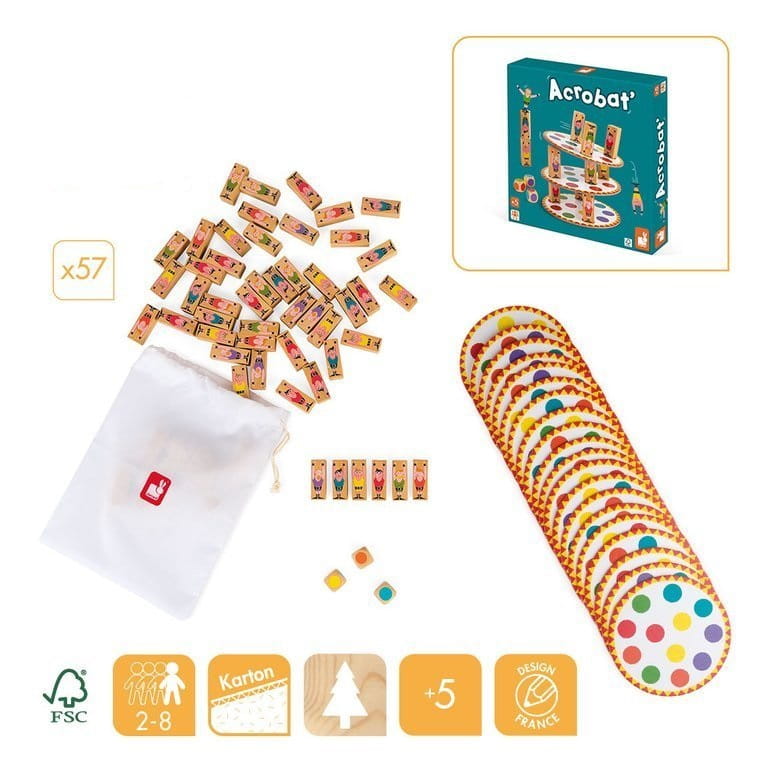 - ELEMENTY: 20 kartonowych plansz + 57 drewnianych figurek akrobatów + 3 drewniane kostki