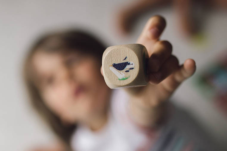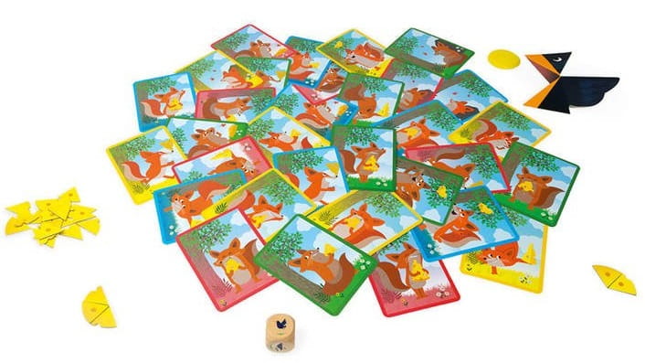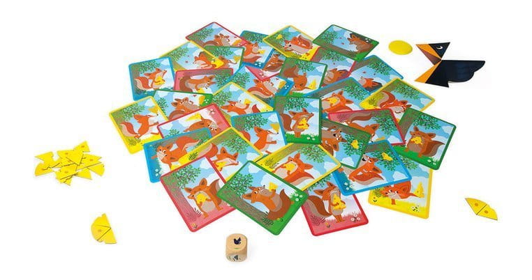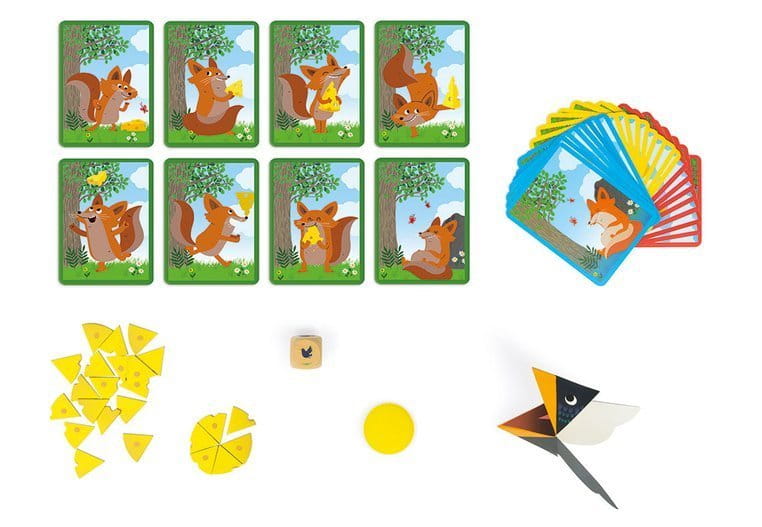 - 1 drewniana kostka z ilustracjami kruka, które obrazują sposób, w jaki gracz, wcielający się w ptaka ma się poruszać z serem z dziobie, zanim upuści go na karty-liski