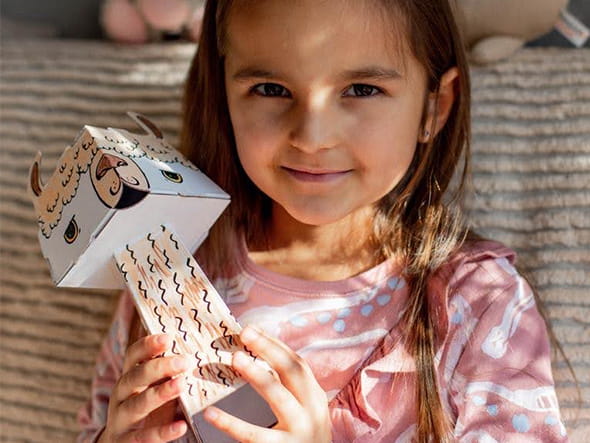 Poznajcie kuzynkę wielbłąda! Kiedy się zdenerwuje, pluje... Możesz mieć grzeczną, przyjazną lamę z figlarnie zaczesaną grzywą. Możesz ją pokolorować farbami, mazakami lub kredkami, a następnie złożyć. Czas na zabawę!