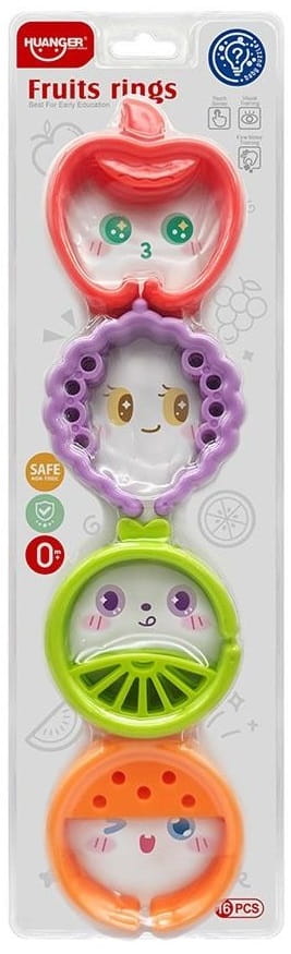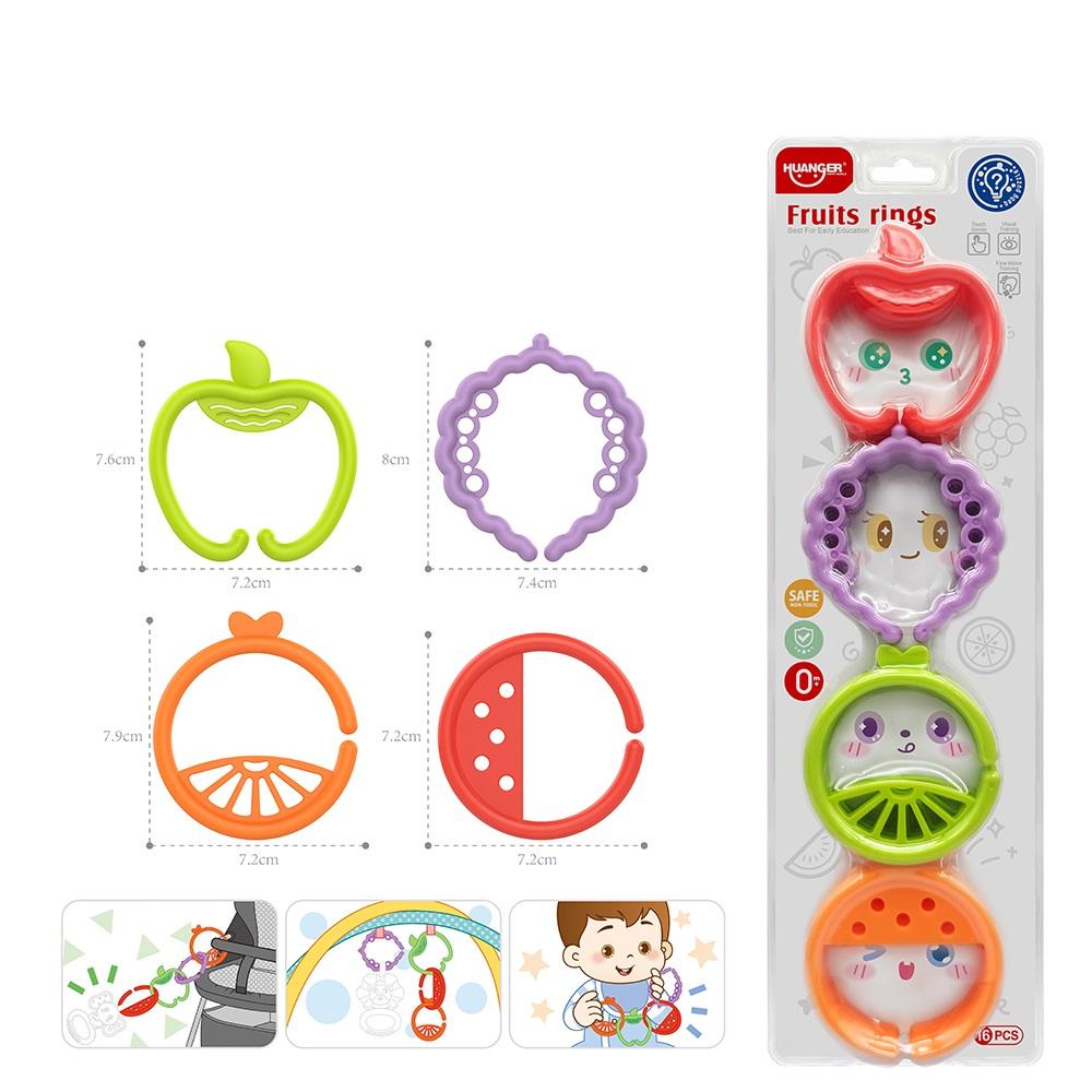 Kolorowe ogniwa w kształcie owoców służące do łączenia oraz mocowania zabawek przy łóżeczku, wózku czy macie edukacyjnej.