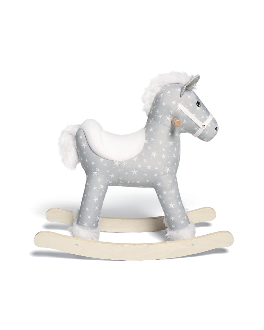 Konik na biegunach Mamas&Papas posiada uroczy wzór w biało-szare gwiazdki, który pobudzi wyobraźnię Twojego dziecka, a jednocześnie znakomicie dopasuje się do większości wnętrz urządzonych w stonowanych kolorach. Miękkie detale w formie przyjemnej w dotyku grzywy i ogonka wykonane ze sztucznego futra sprawią, że maluch z radością będzie głaskał swojego nowego przyjaciela podczas zabawy. Produkt posiada solidne i wytrzymałe drewniane bieguny oraz uchwyty, które pozwolą szkrabowi utrzymać równowagę podczas bujania.